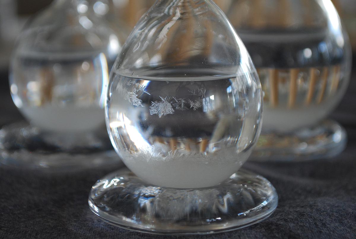天気管のこと。18世紀ヨーロッパで航海時の天気予報機として使われており、天候や気温(20℃以下)の変動により毎日結晶の様子が変化します。