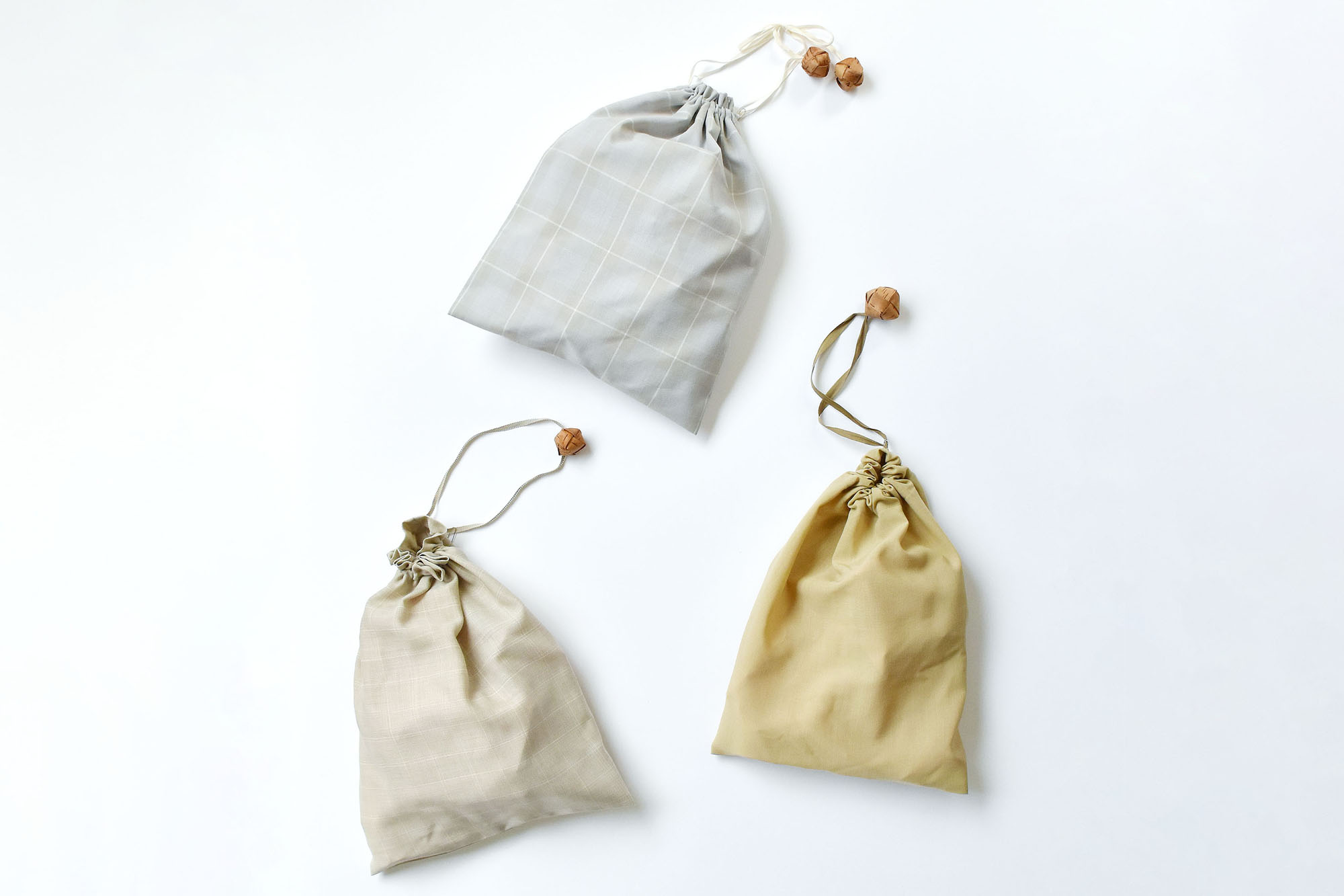 巾着はパジャマを入れて無造作にお部屋に置いておいたり、旅の荷物の仕分けや普段使いにももちろん、さまざまなシーンで活躍してくれます。