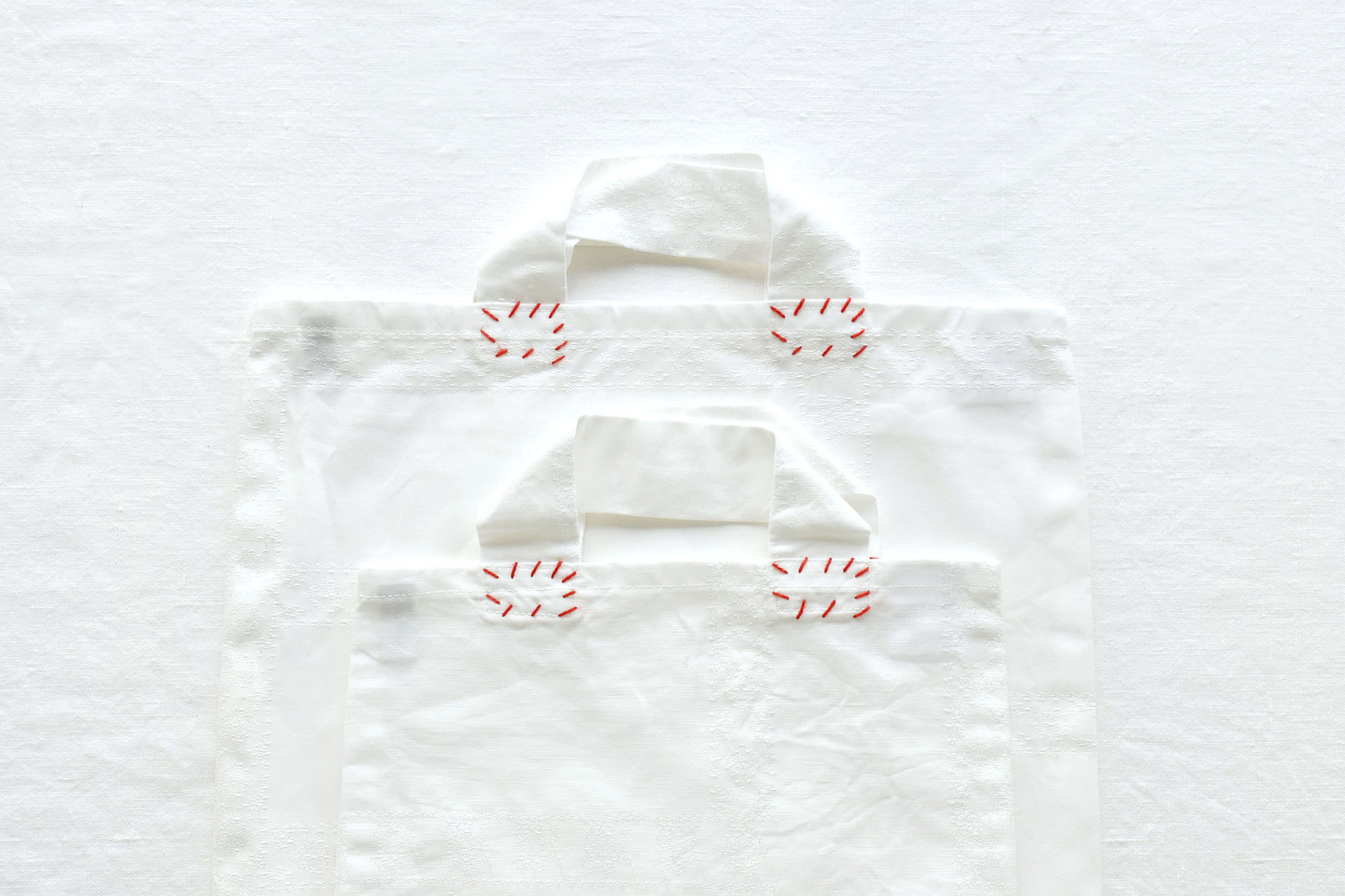 お洋服とお揃いの白の織り生地にワンポイントの赤ステッチ。