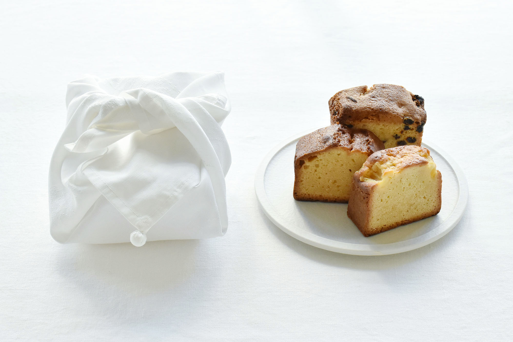 ランチョンマットにもなる大判ハンカチに包まれた3個セットとそれぞれ単品でのご用意です。
