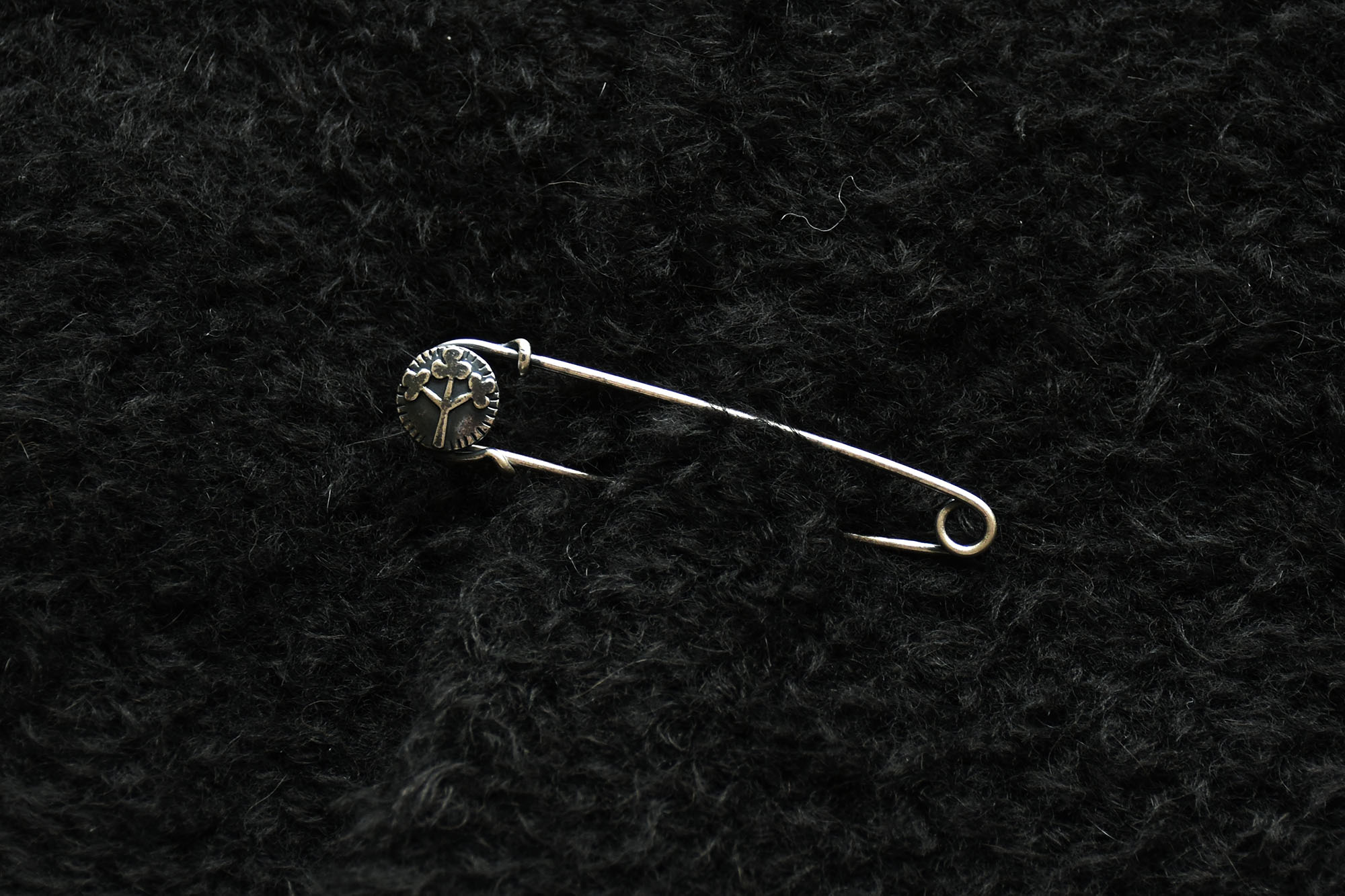 前開きデザインになっており、付属のピースマークオリジナルピンで留めていただけます。ピンなしでそのままでももちろん、お手持ちのブローチやコサージュなどで代用しても。