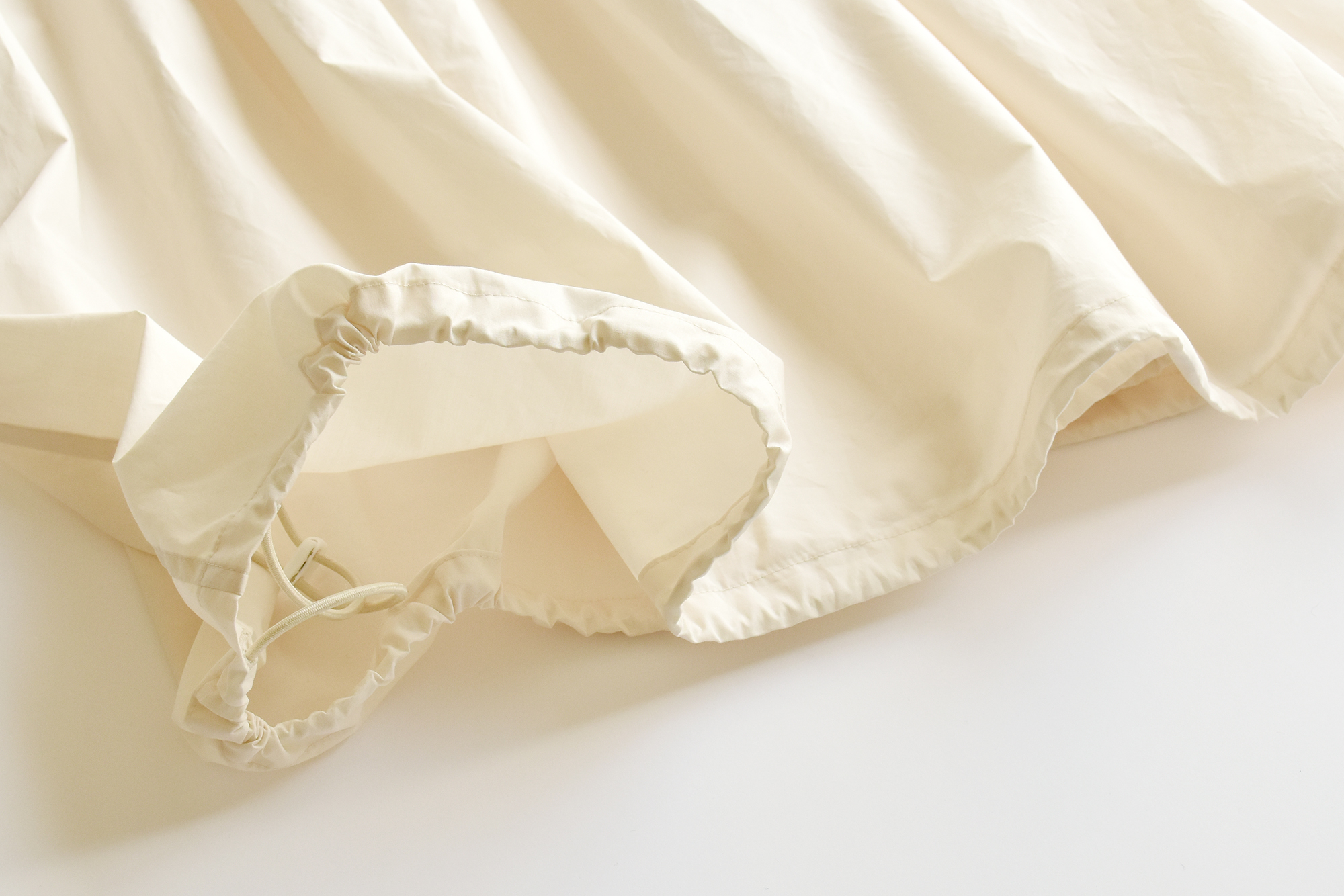 裾にはぐるりとゴムが入っており、内側のパーツできゅっと絞るとバルーンシルエットにも。丈感も少し変わってまた違った表情になります。