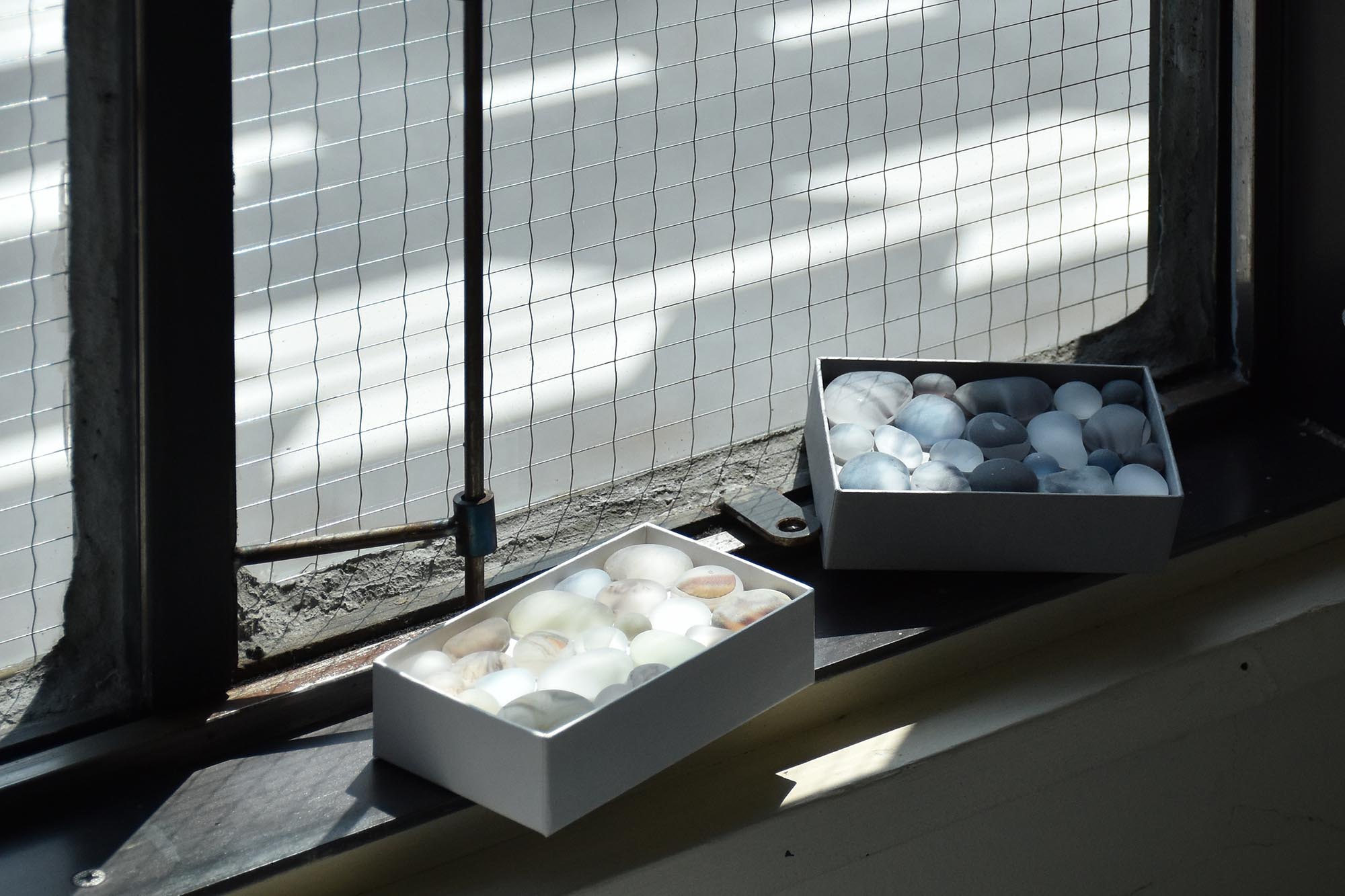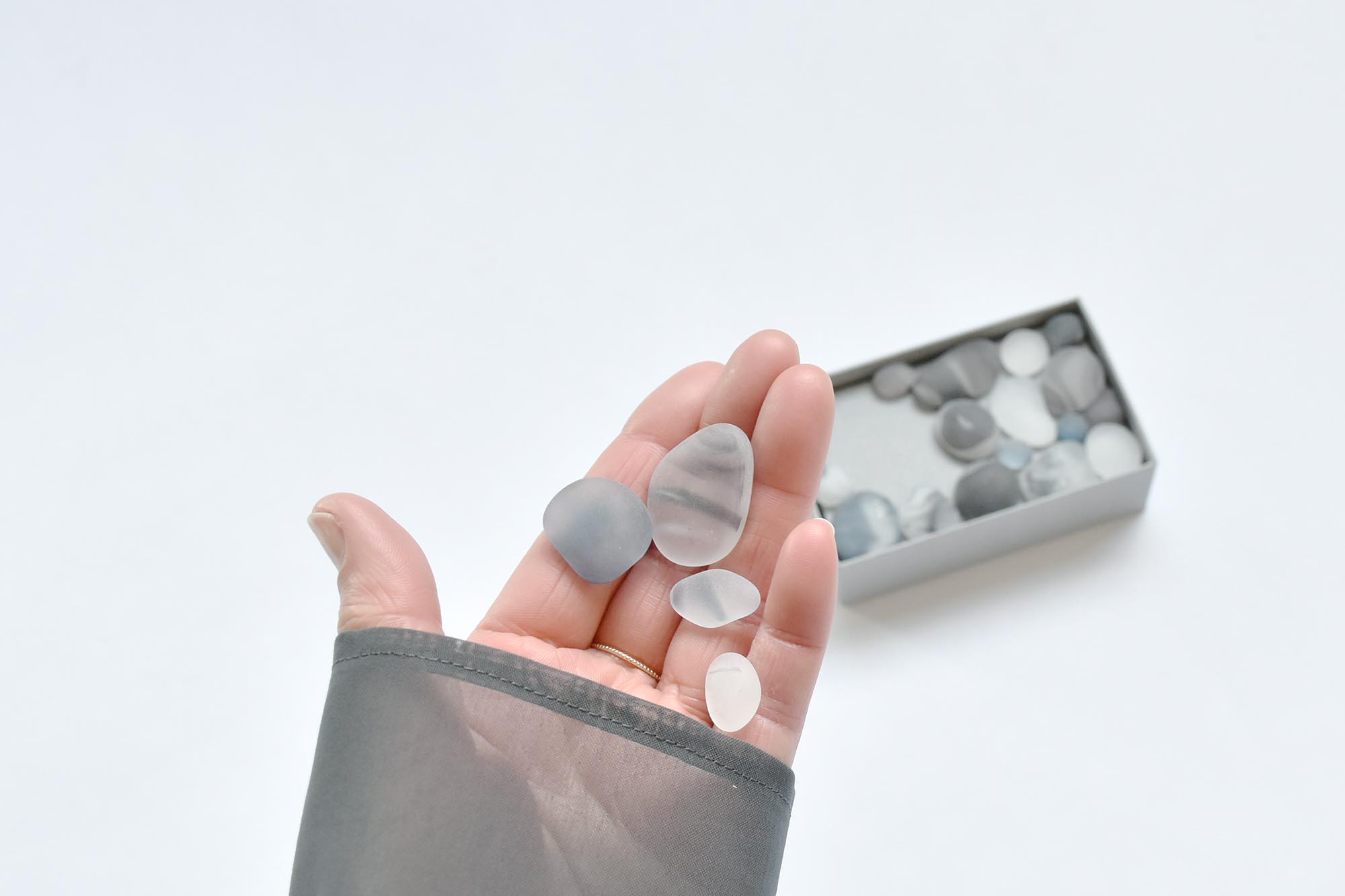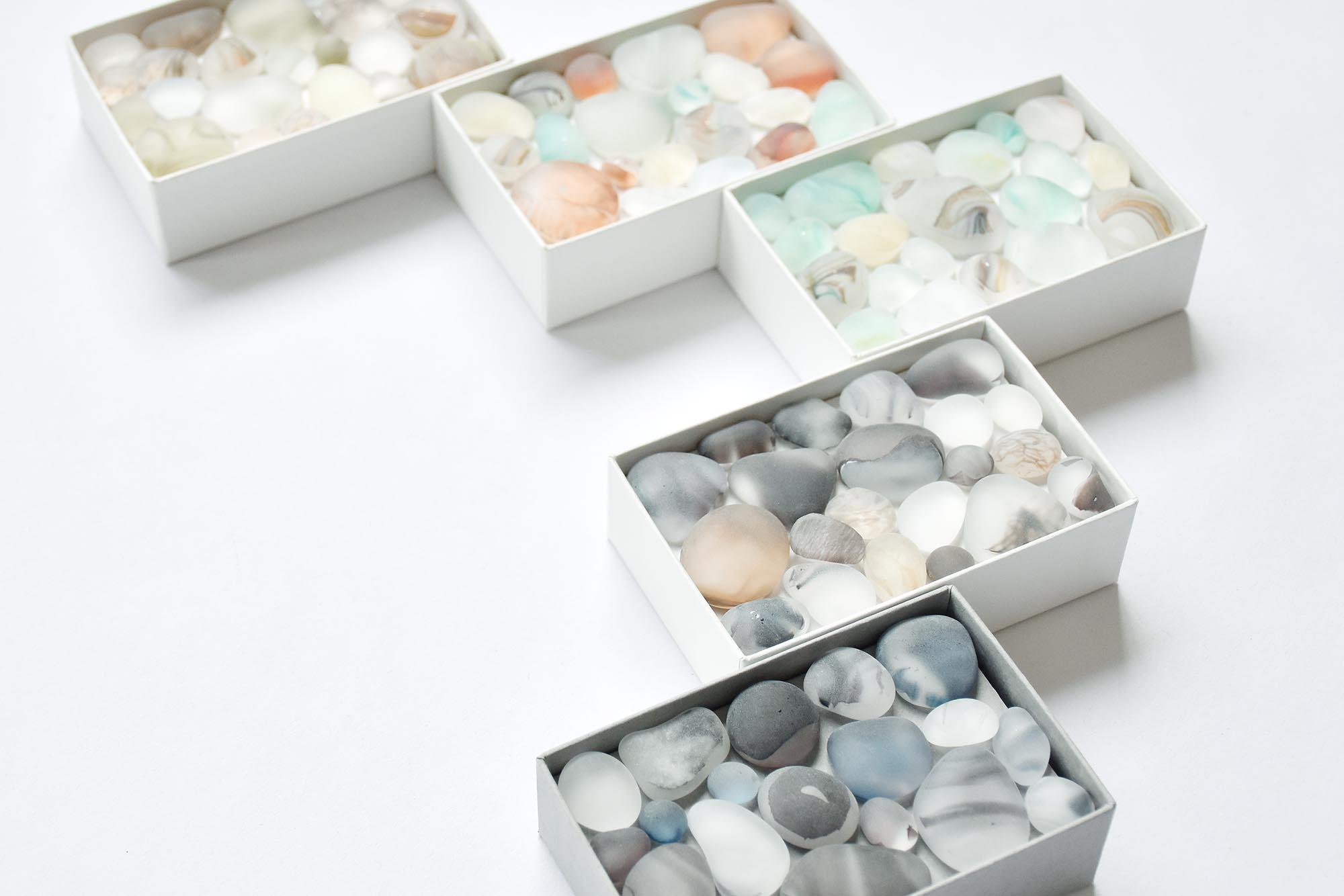 カードサイズほどの箱のなかに色とりどりぎゅっと詰まった、ガラス小石の小箱。