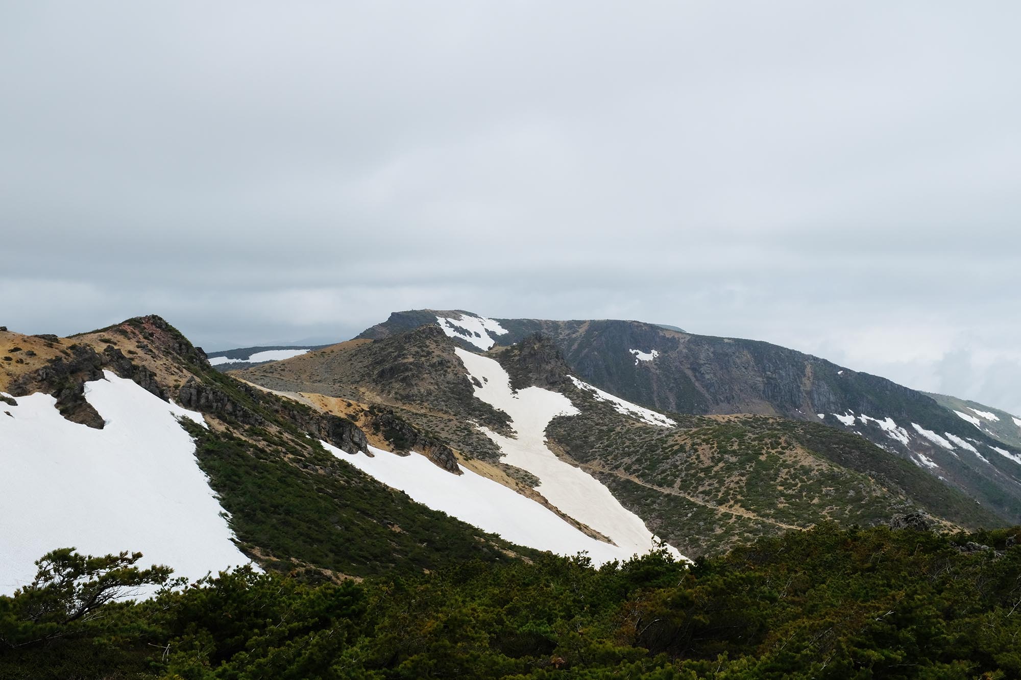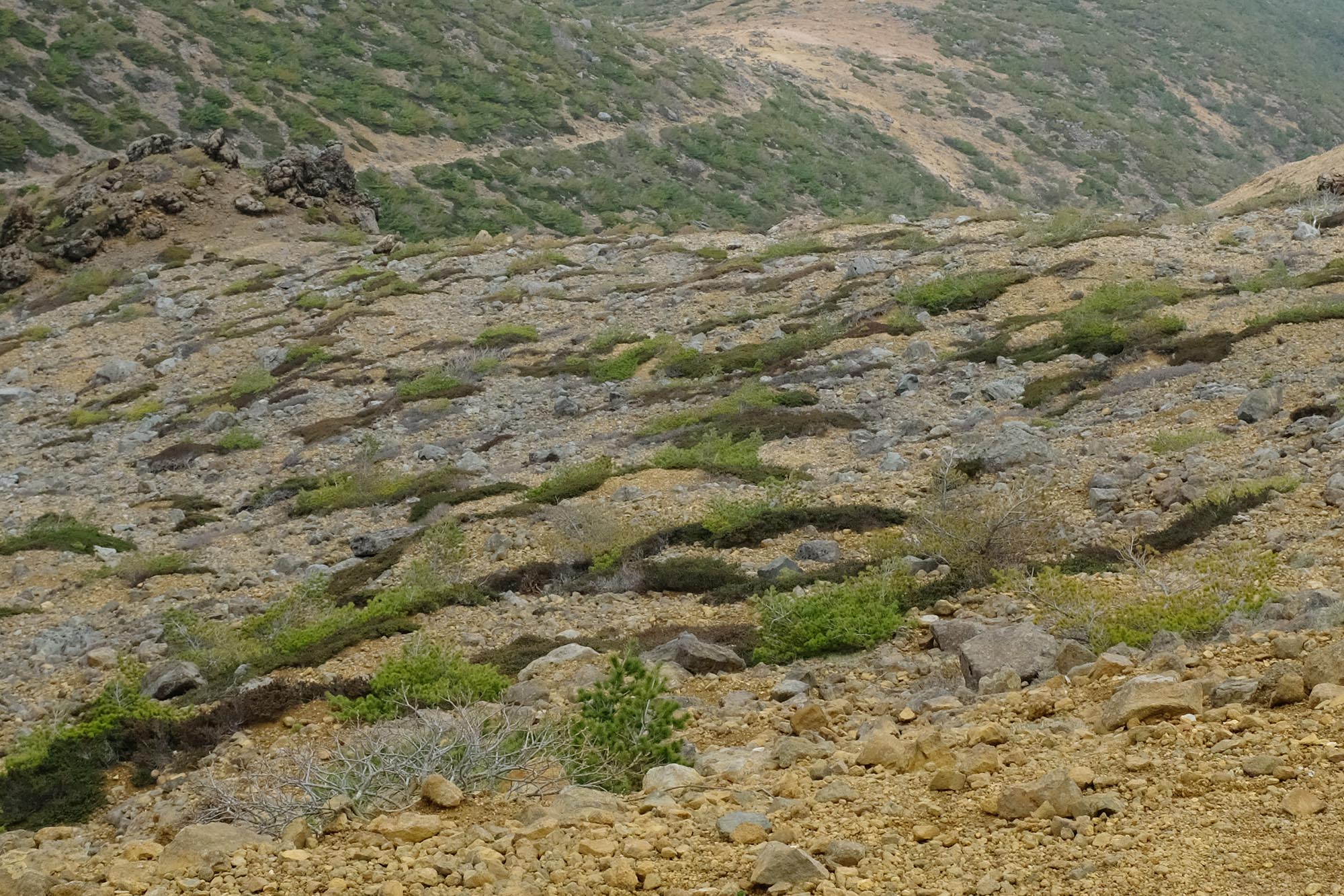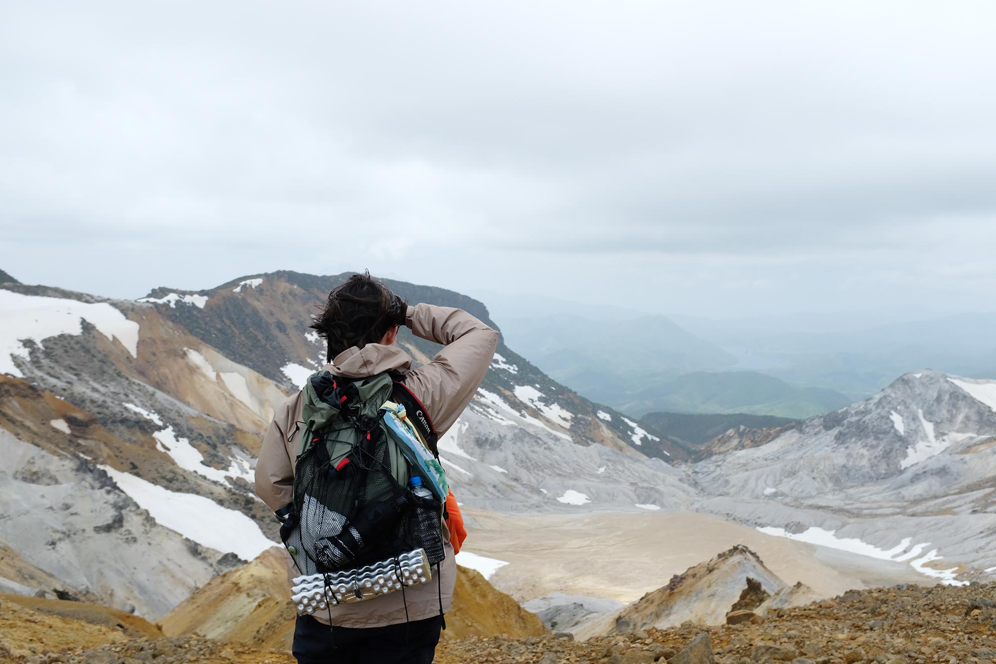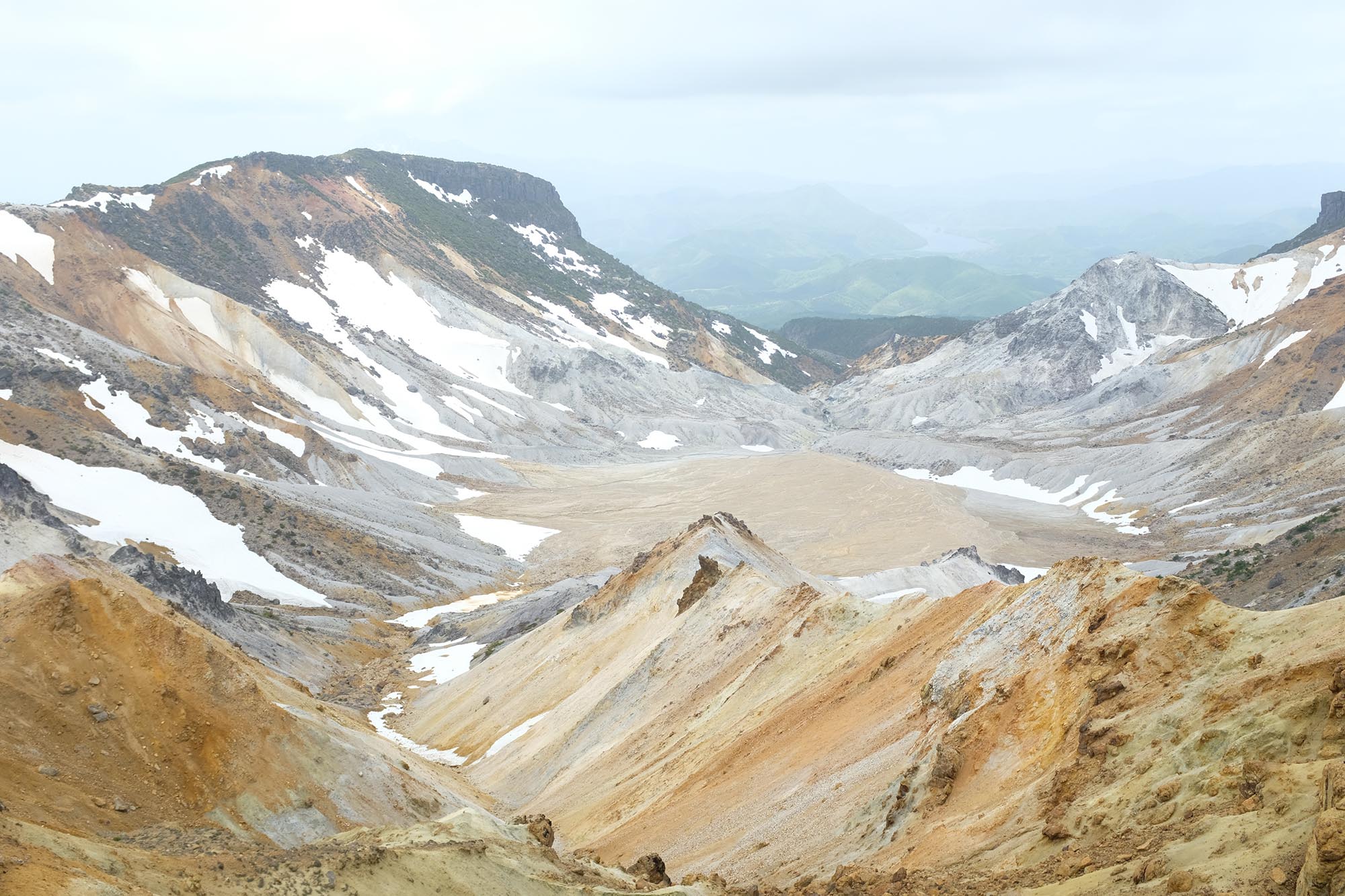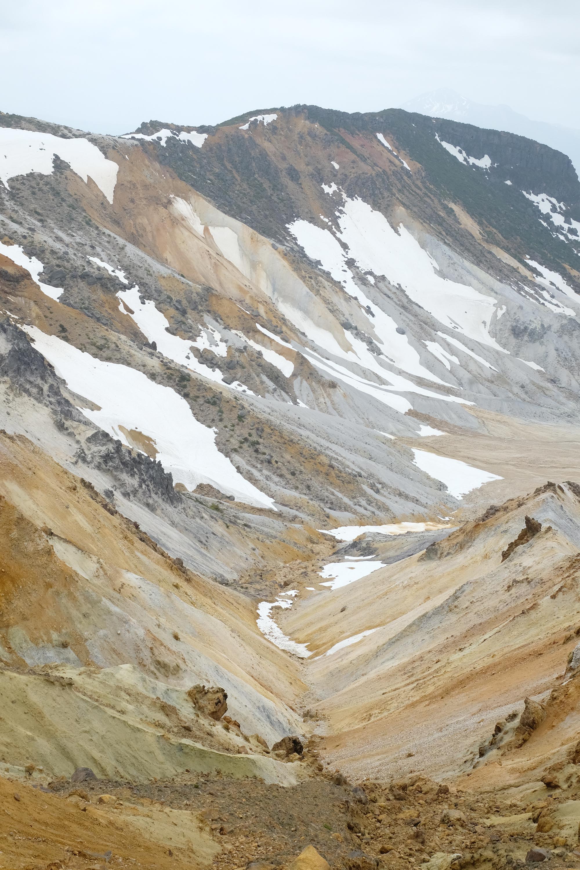 少しずつ姿を現してくる沼ノ平火口の風景。