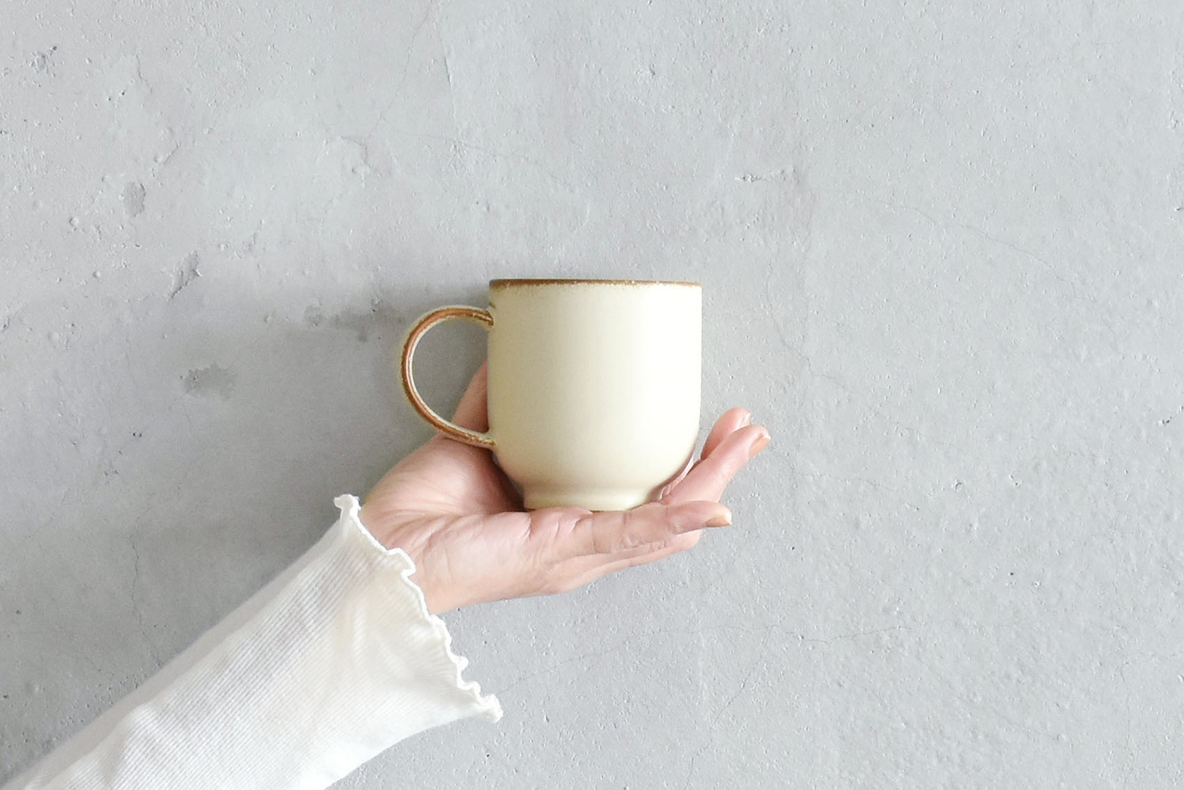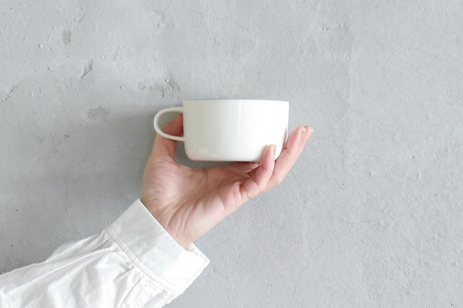 安定感のある背の低いマグカップ、潔い真っ白さに縁取る細いグレーがアクセントになっています。