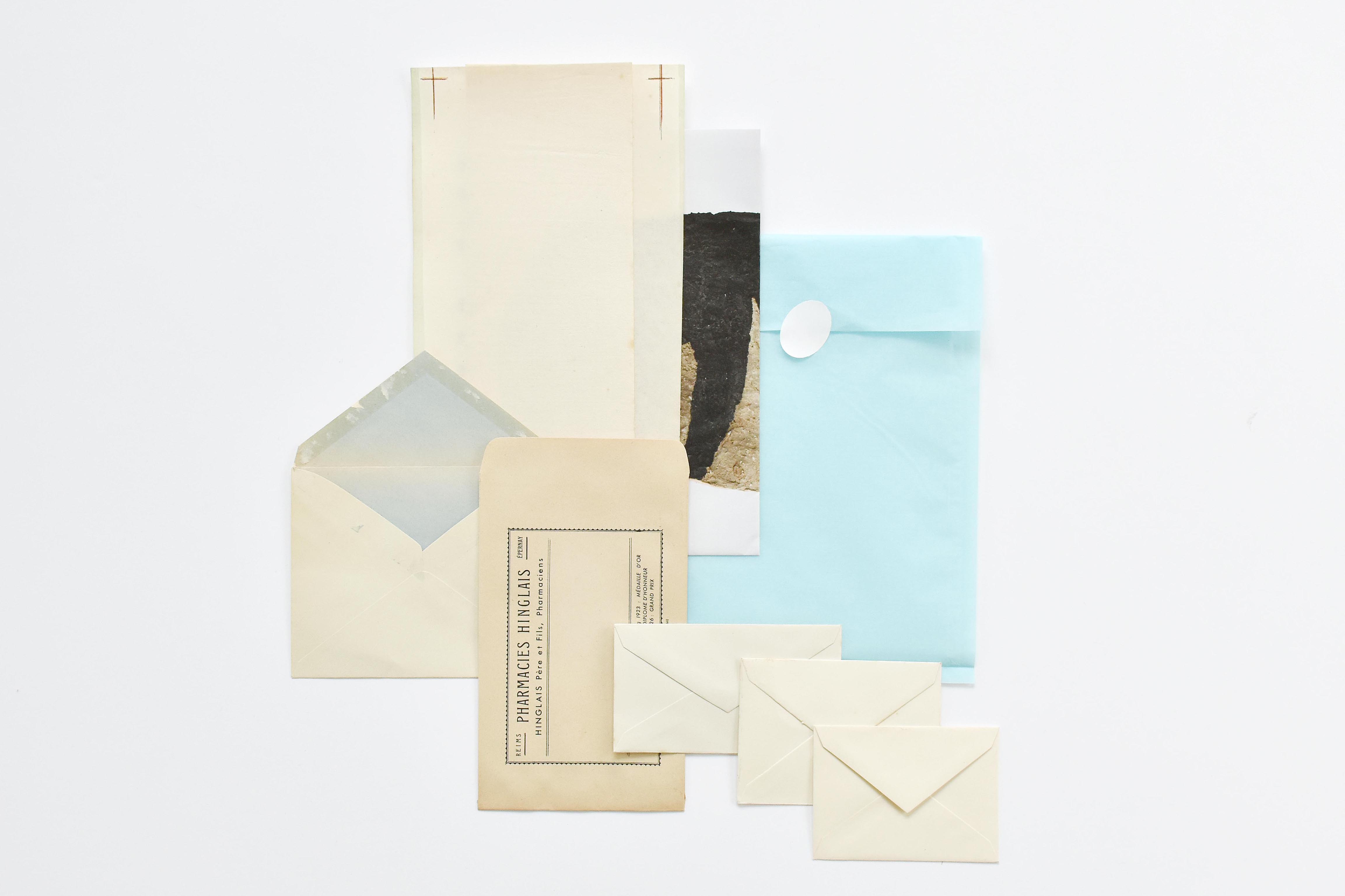 旅のお土産でいただいた、さまざまな年代の紙と封筒。