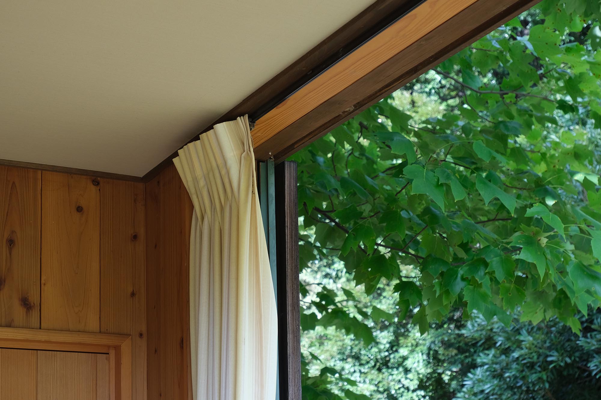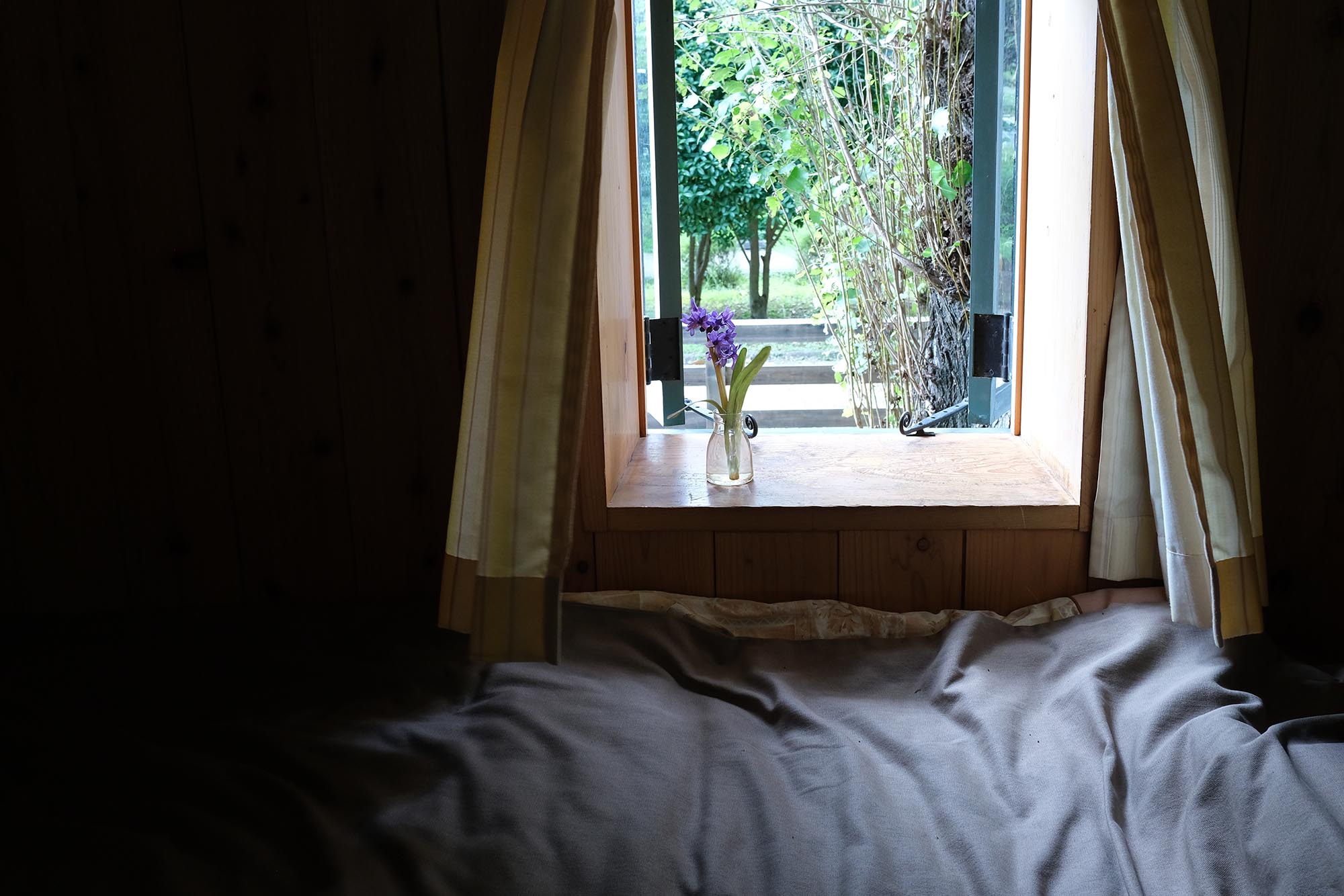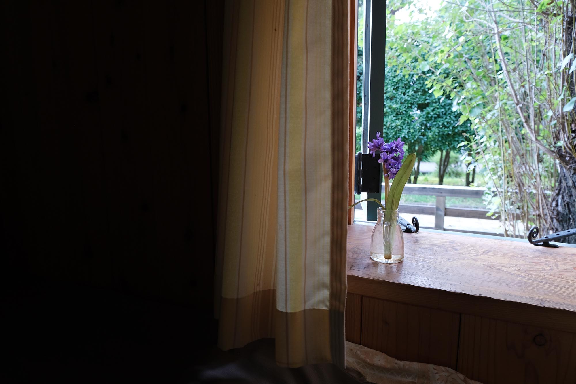 緑灰色の窓枠、うす黄色のカーテン、窓辺のヒアシンス、十字の明かり取り、深い木目の色。