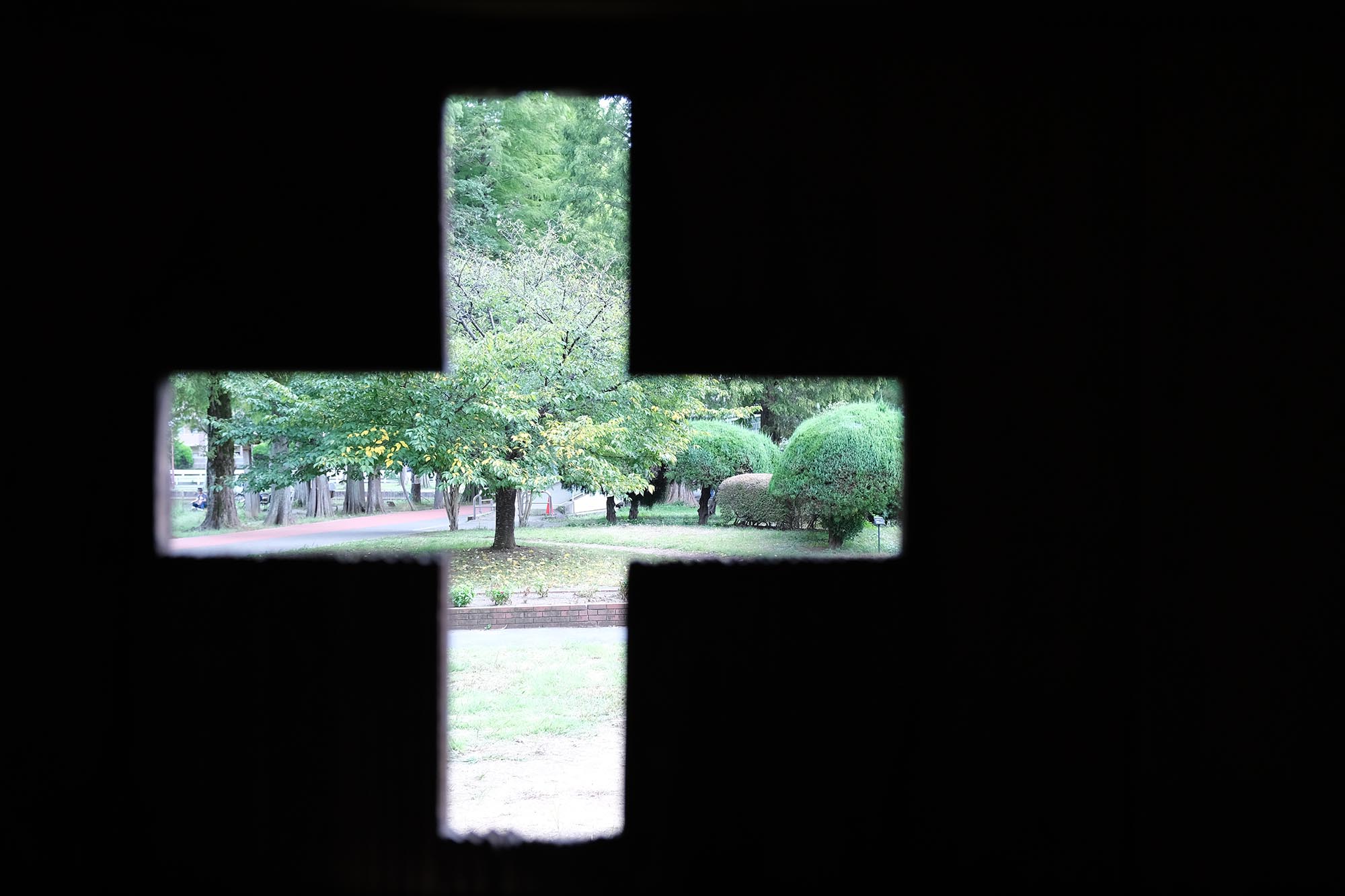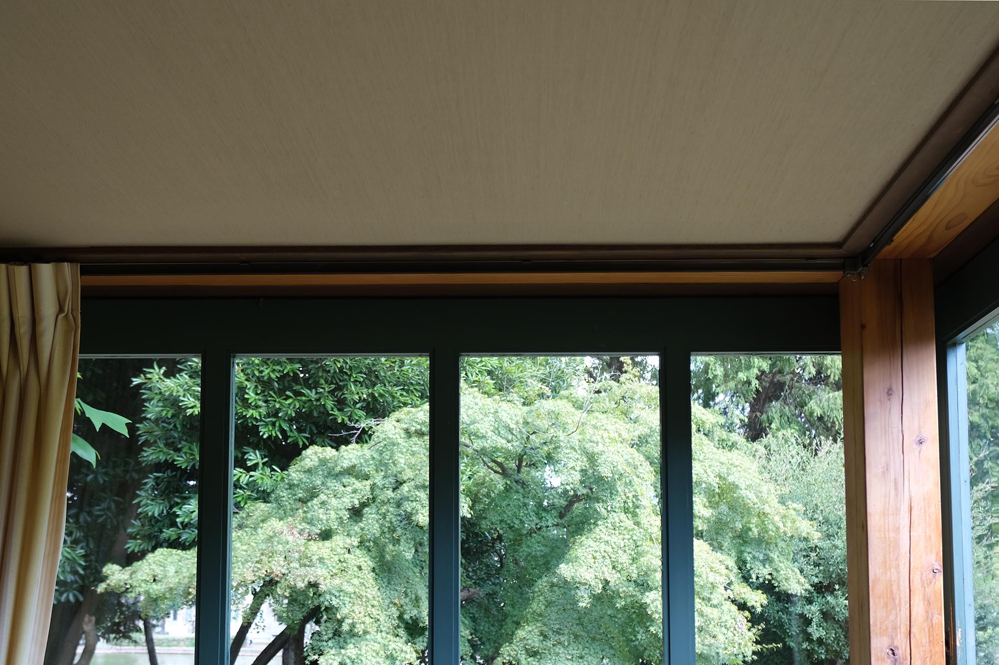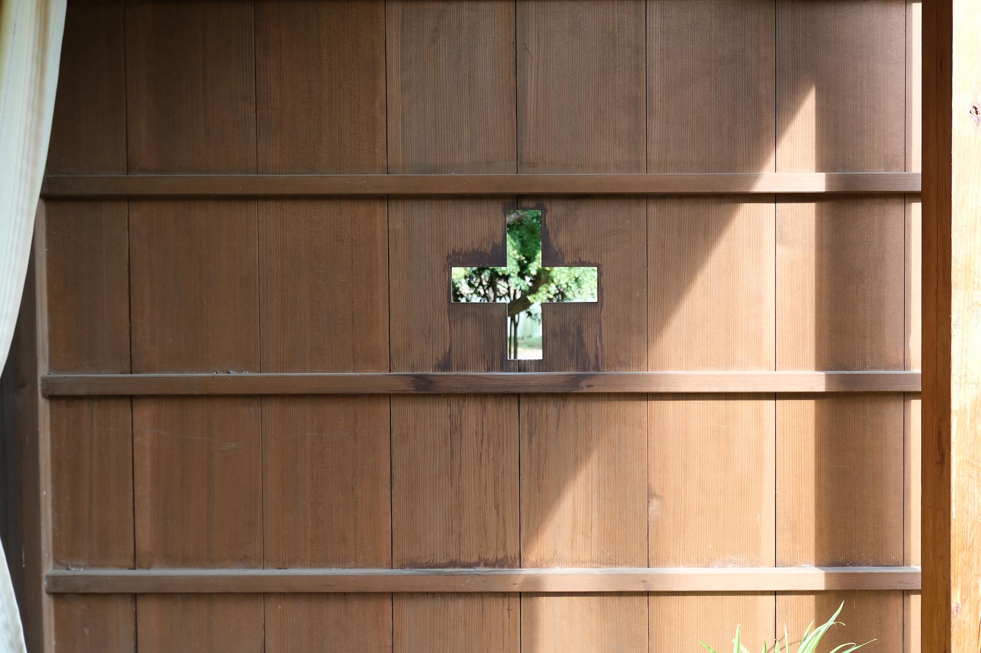緑灰色の窓枠、うす黄色のカーテン、窓辺のヒアシンス、十字の明かり取り、深い木目の色。