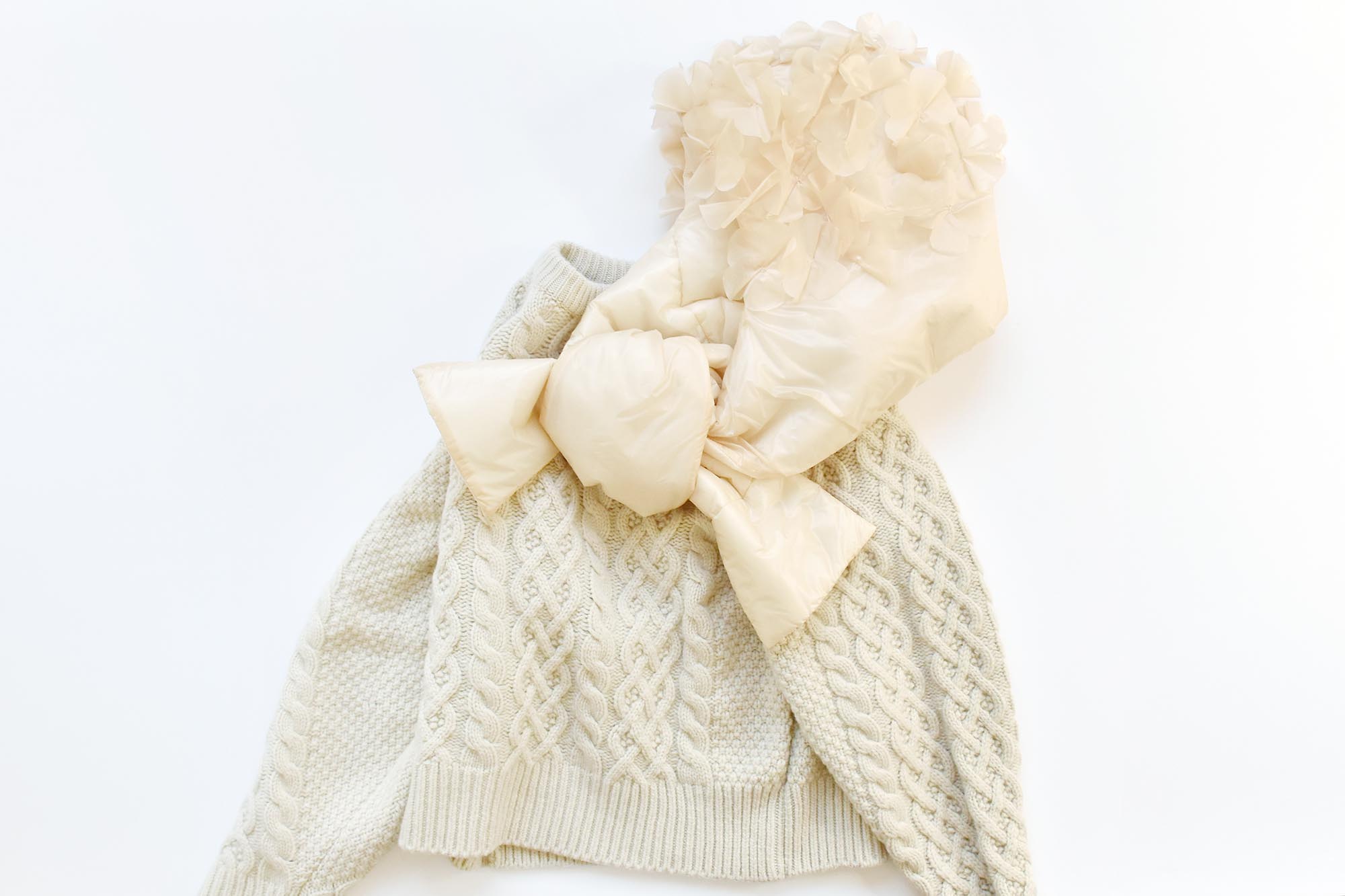フード部分にはお花があしらわれ、かぶるとすっぽりと頭全体をおおってとても暖か。