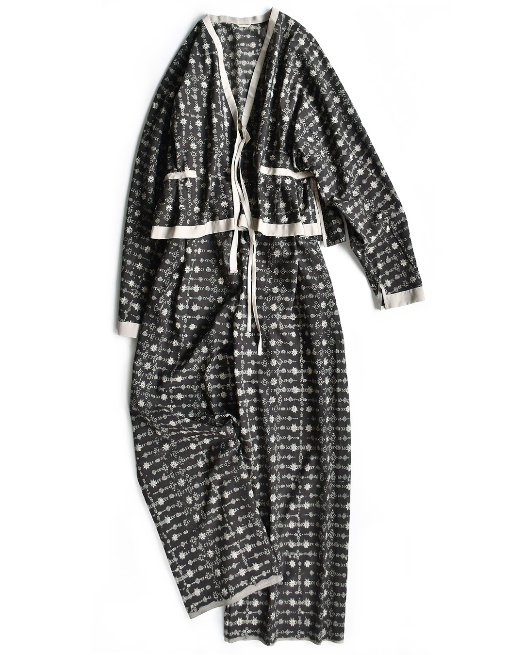 かすれたような雪模様のプリントが味わい深い、インド綿プリントのトップスとパンツ。