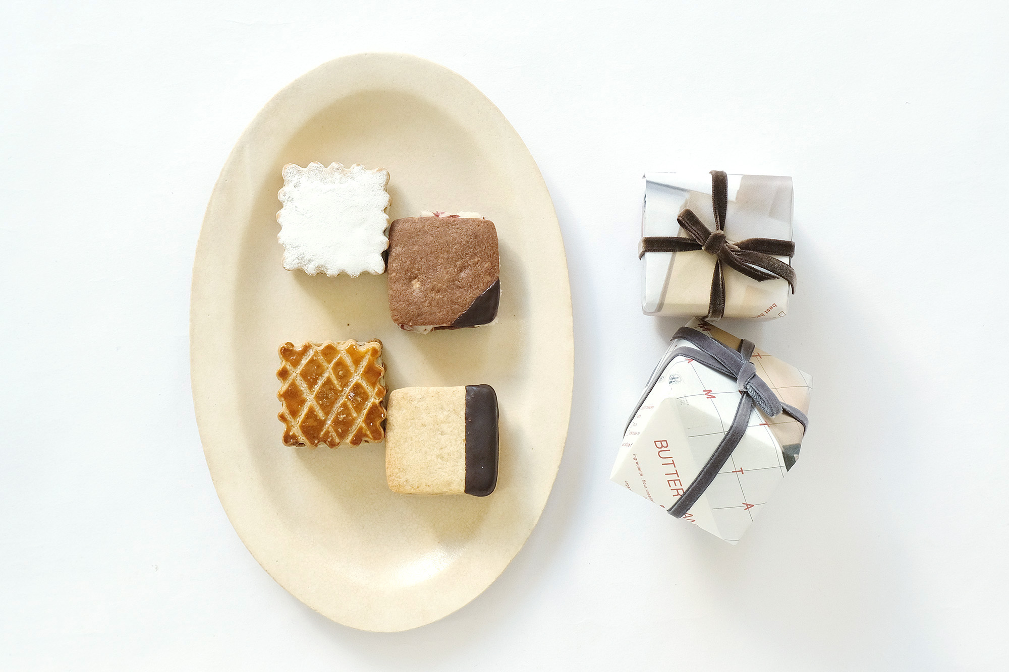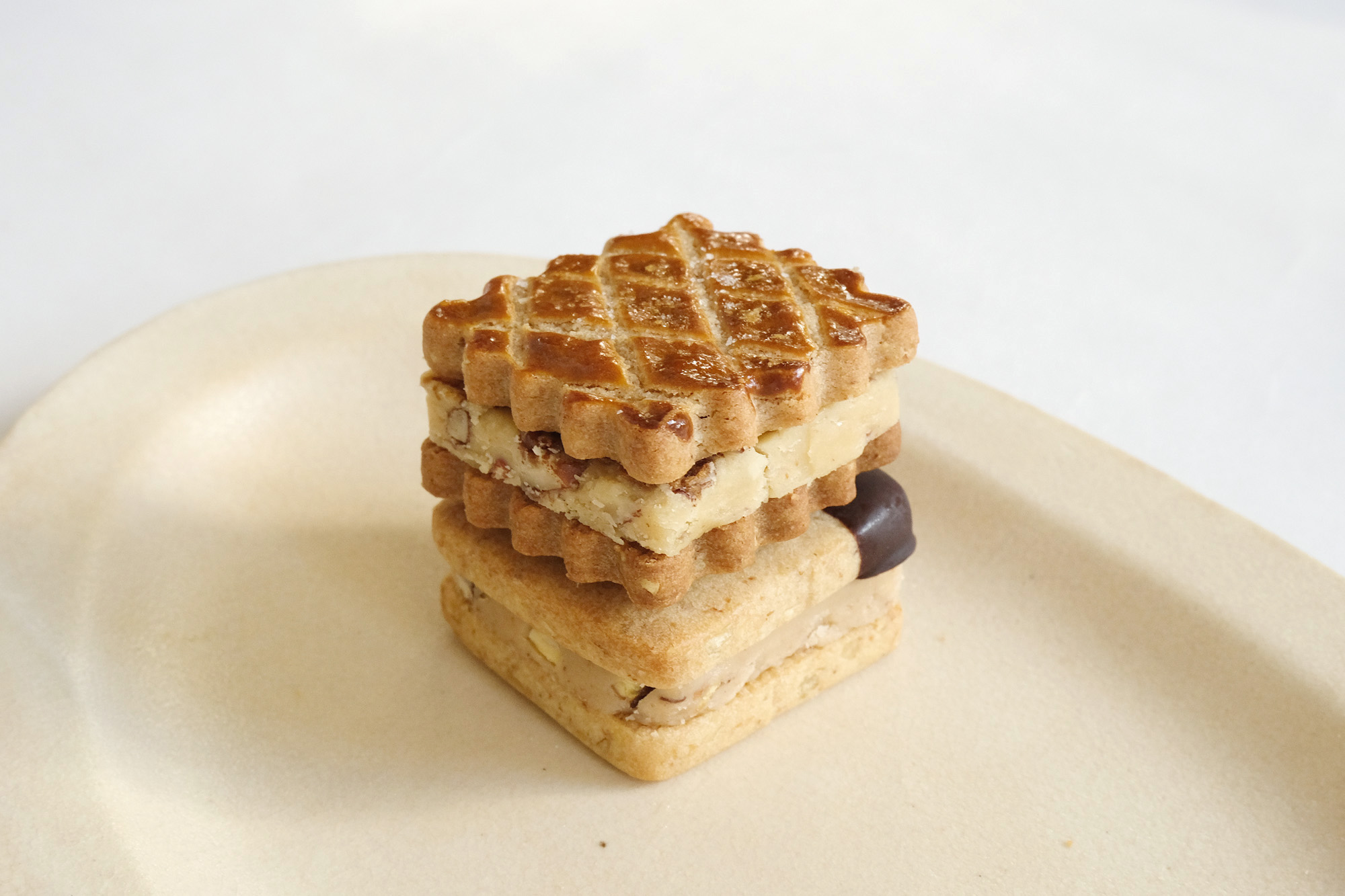 mangataさんが今年旅をした沖縄で出会った黒糖を使ったバターサンド。スターアニス、ジンジャーなどのスパイスと黒胡椒と塩をアクセントに加えました。