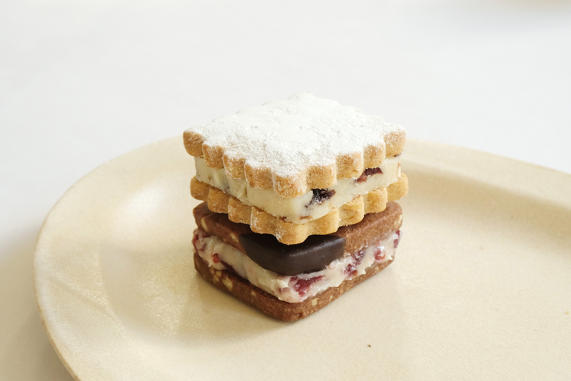 洋酒に漬け込んだドライフルーツ(クランベリー、オレンジピール、レーズン、いちじく)を入れたバタークリームをスパイスを効かせたサブレでサンド。サブレの表面には粉糖をまぶしstollenをイメージしました。