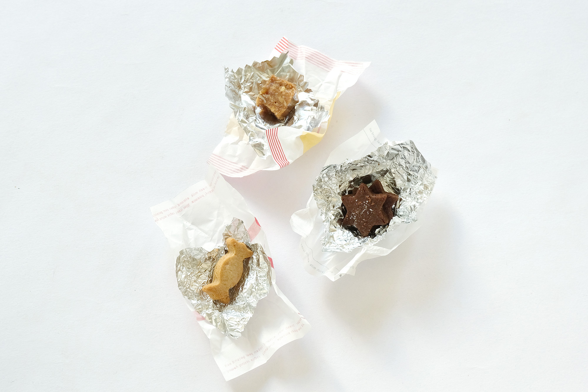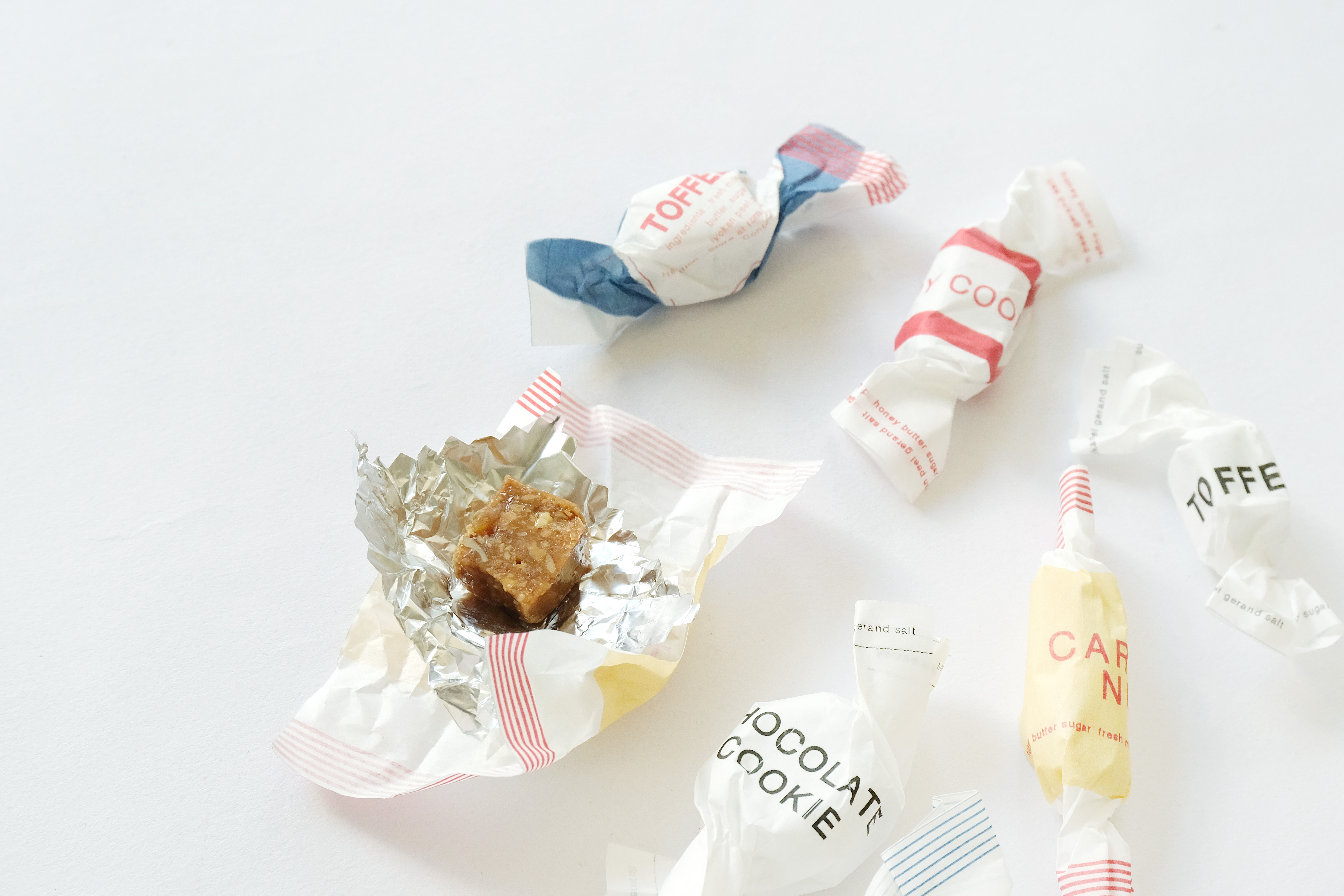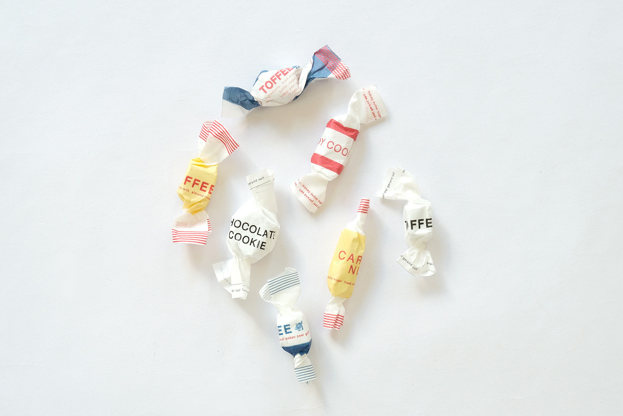 キャンディ包みのちいさなクッキーとちいさなトフィー。缶を開けたとき、カラフルな包装に心が躍ります。
