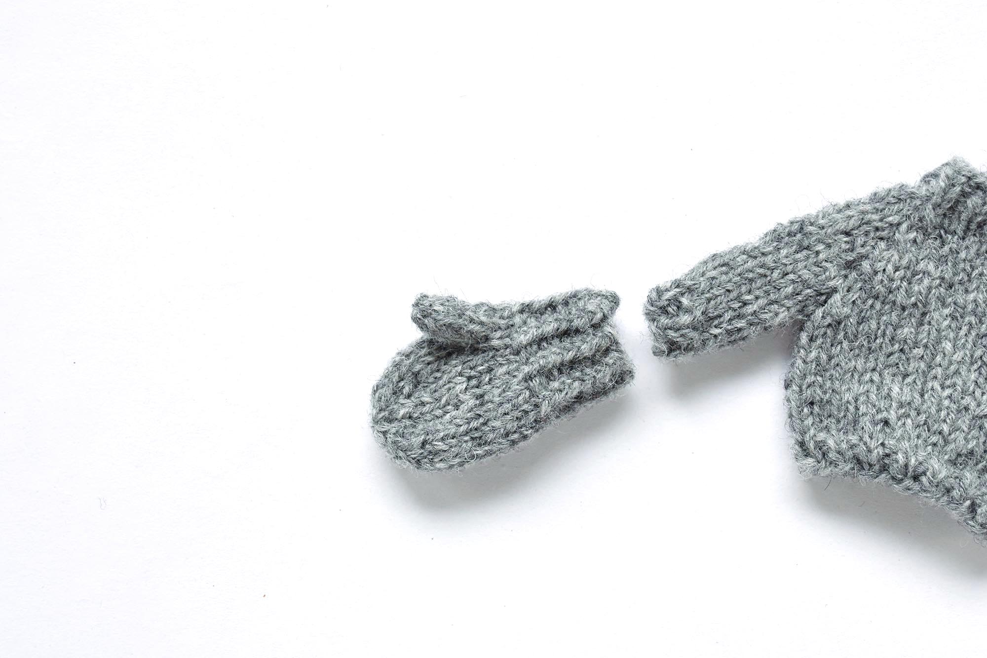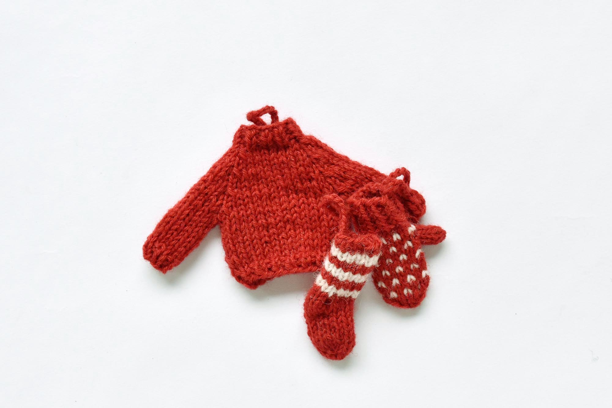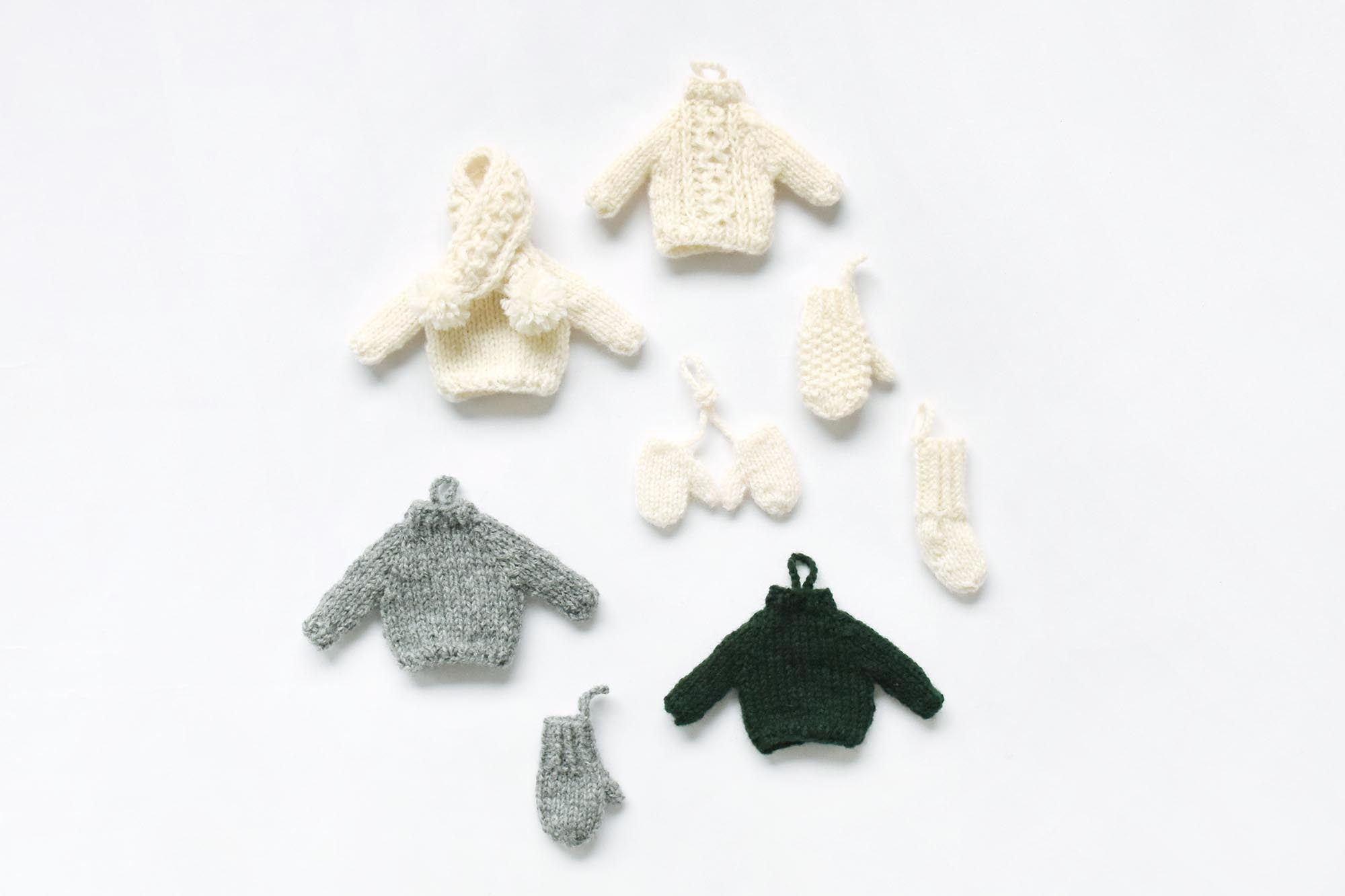 ちいさく編まれたセーター、ミトン、ズボン、ブーツ、マフラー。