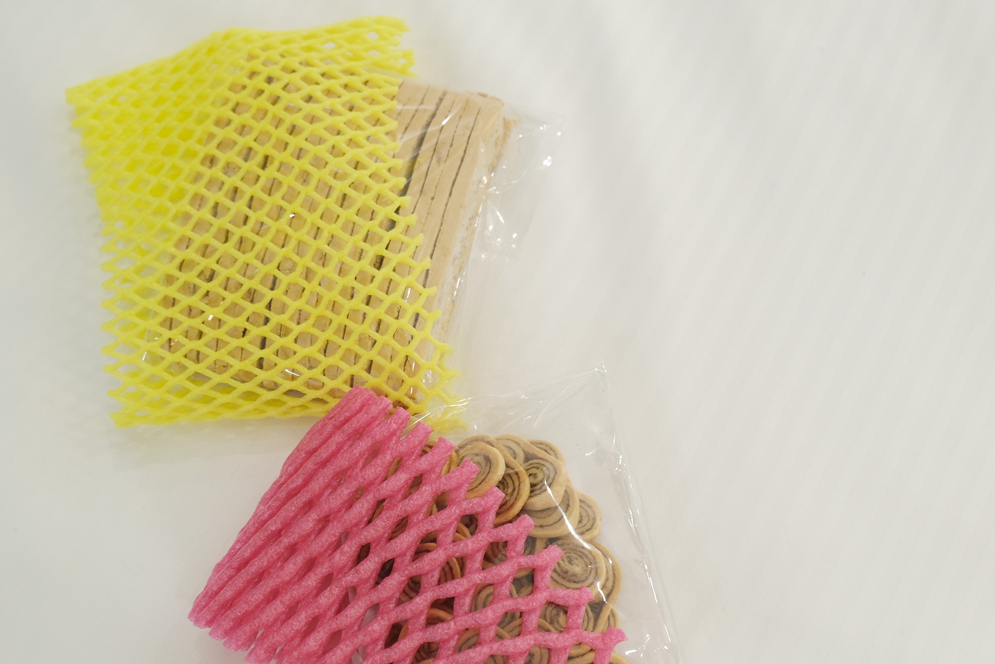 お菓子の梱包材として使われていたフルーツキャップの色が可愛い。