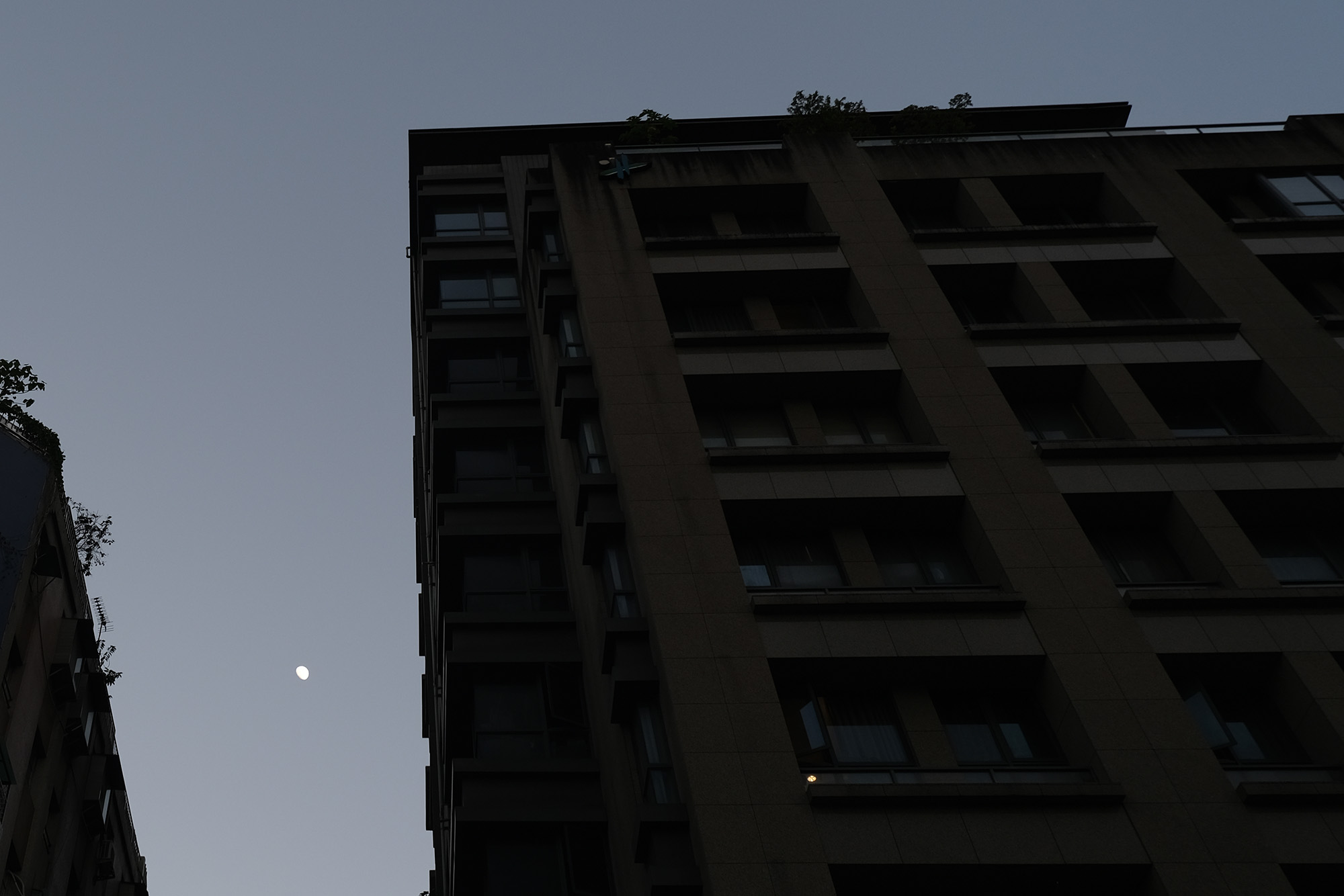 夕刻には ビルの隙間に満月から少し欠けたお月様。