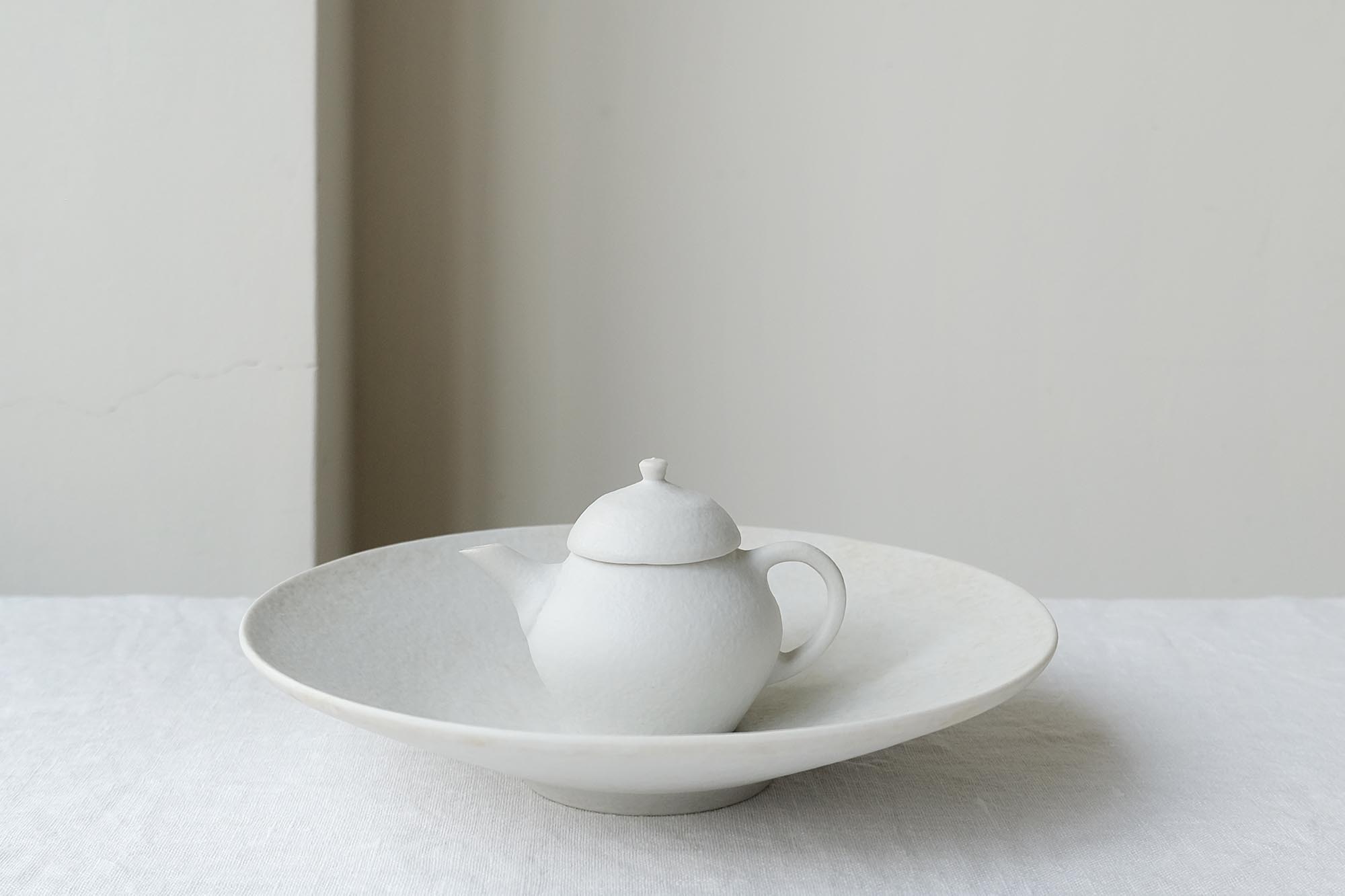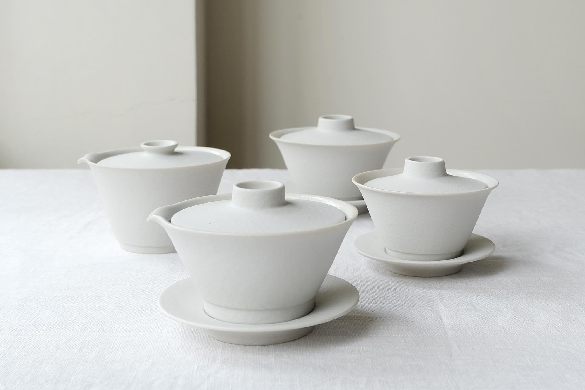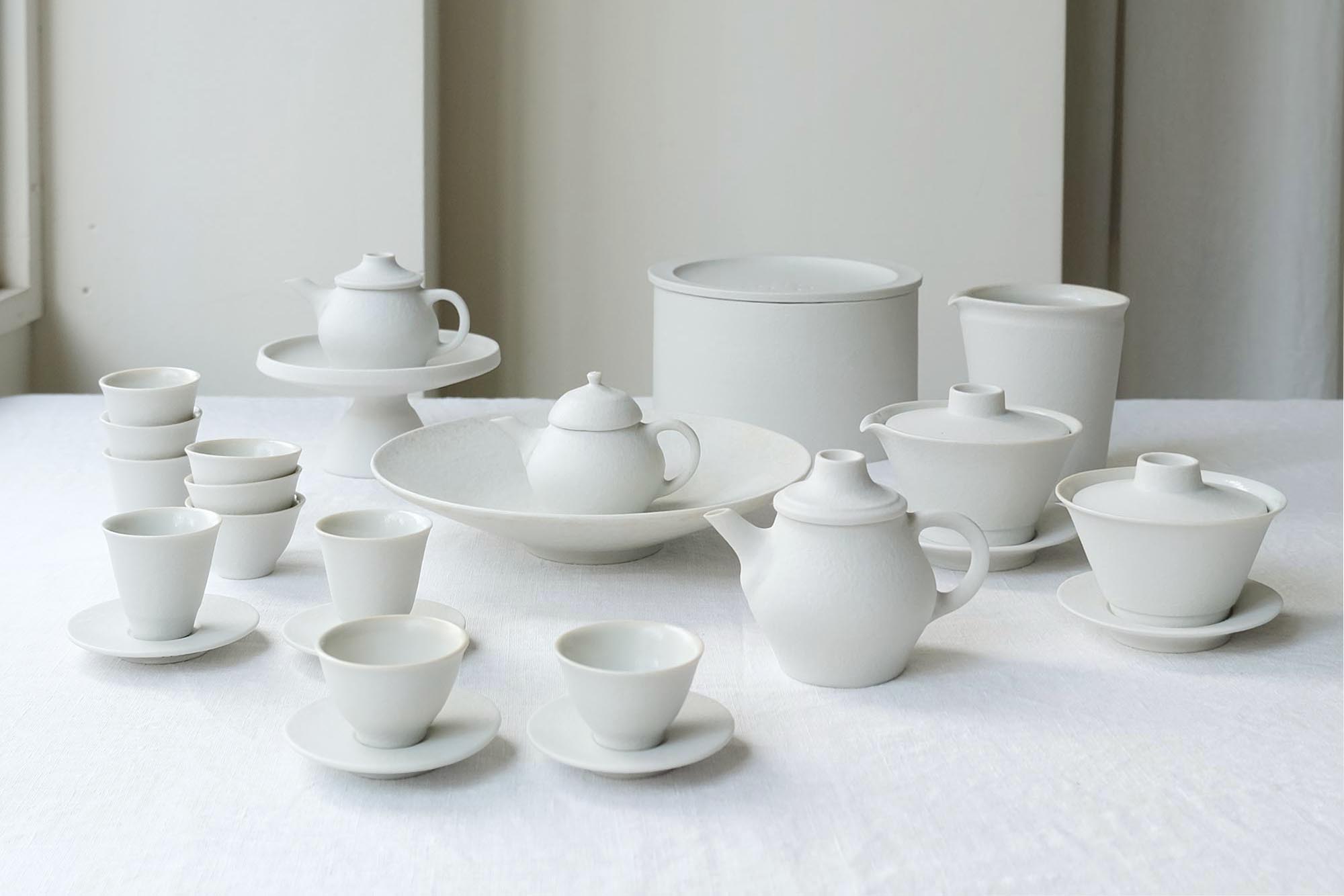真っ白な磁器土が清々しく、すっきりとした直線と曲線から成る美しい茶器と茶道具。