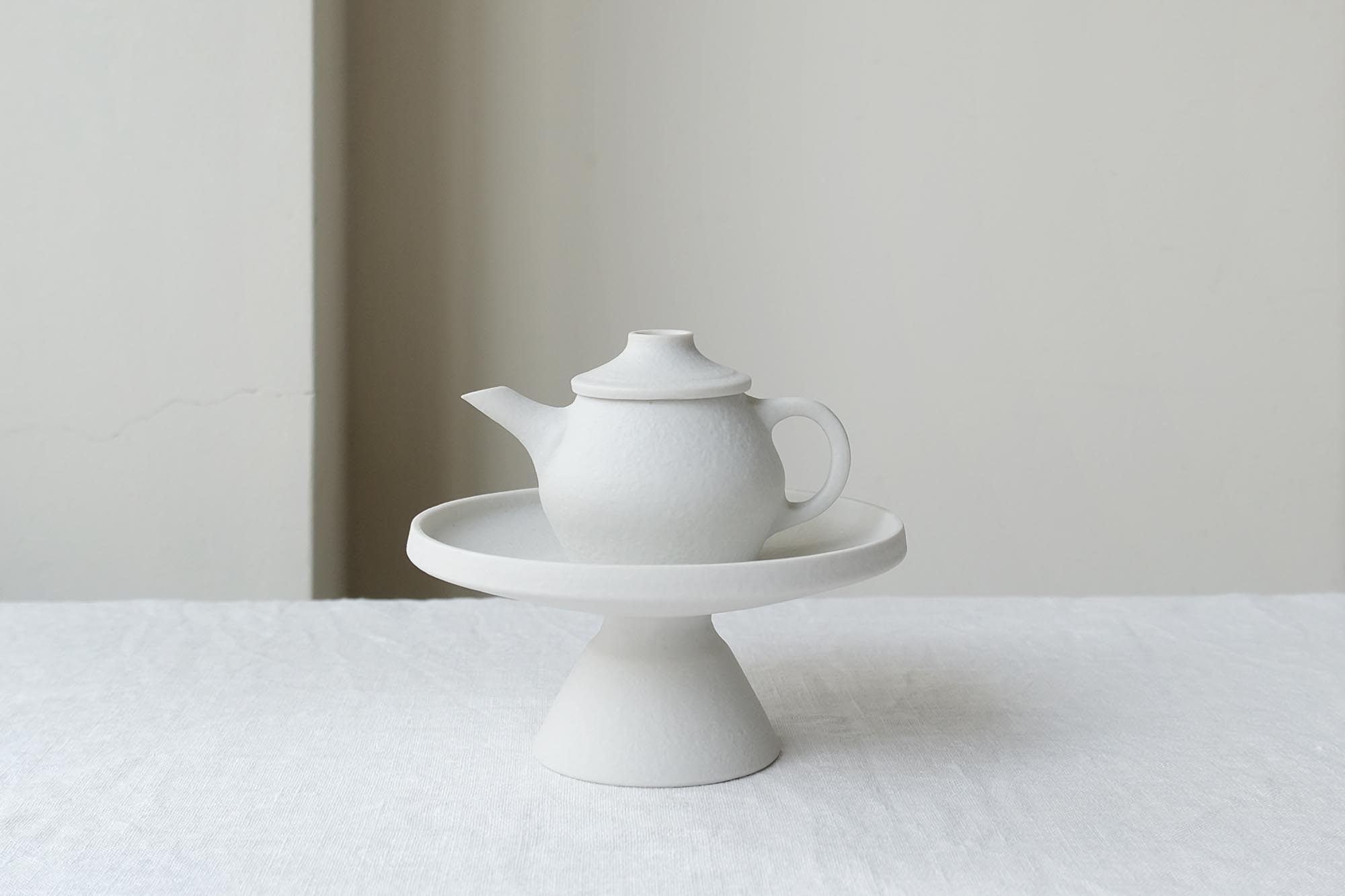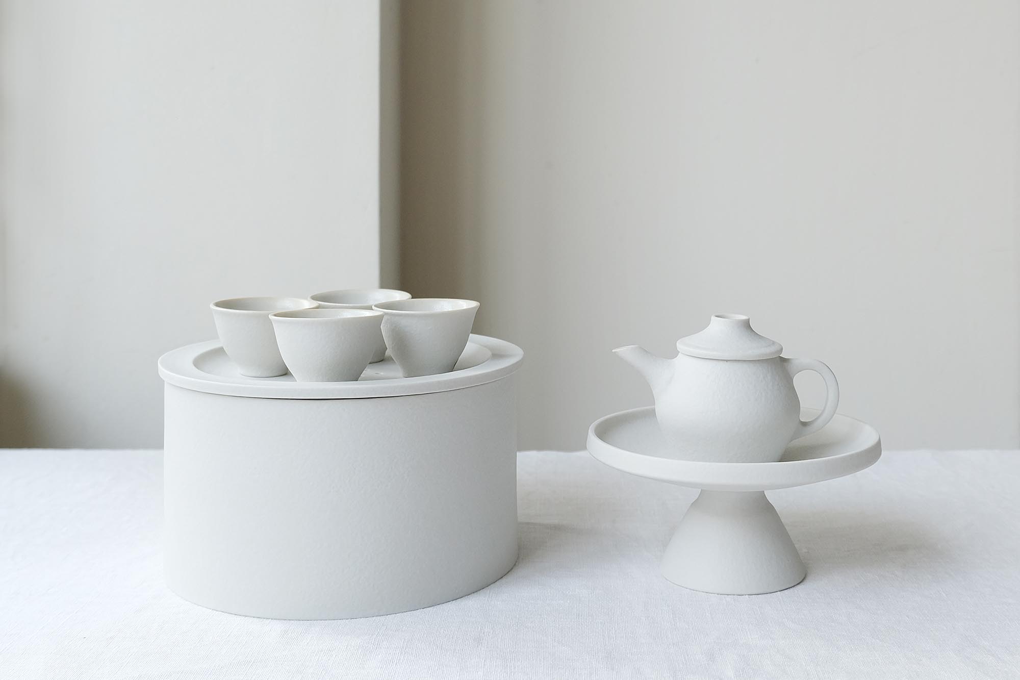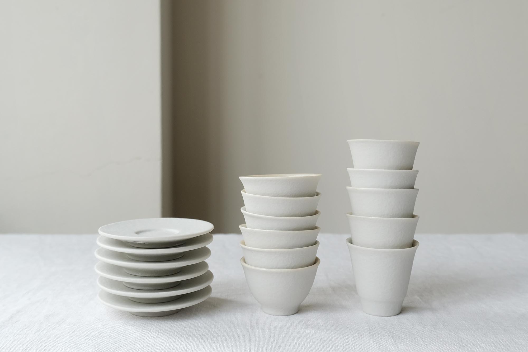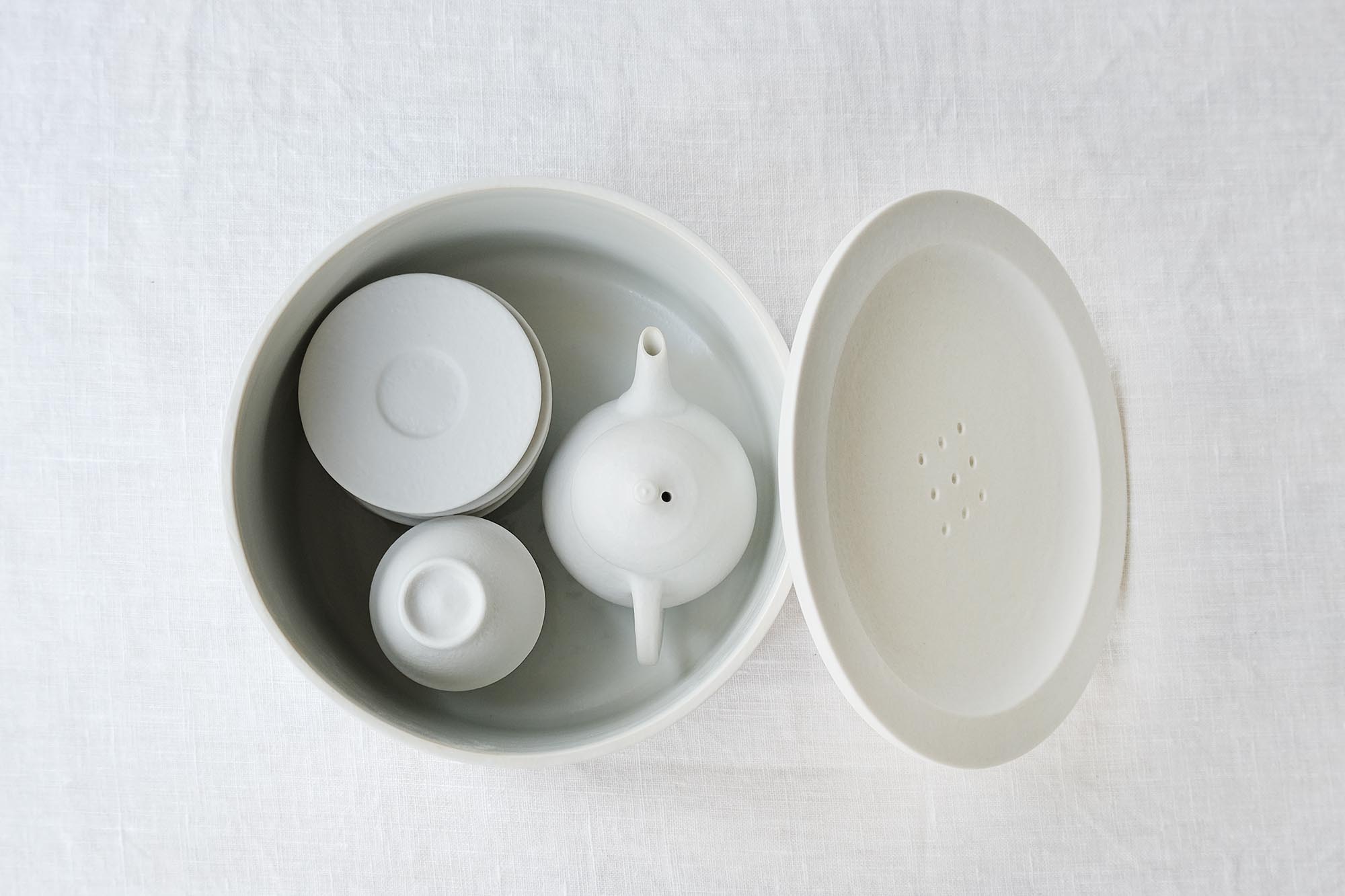 真っ白な磁器土が清々しく、すっきりとした直線と曲線から成る美しい茶器と茶道具。