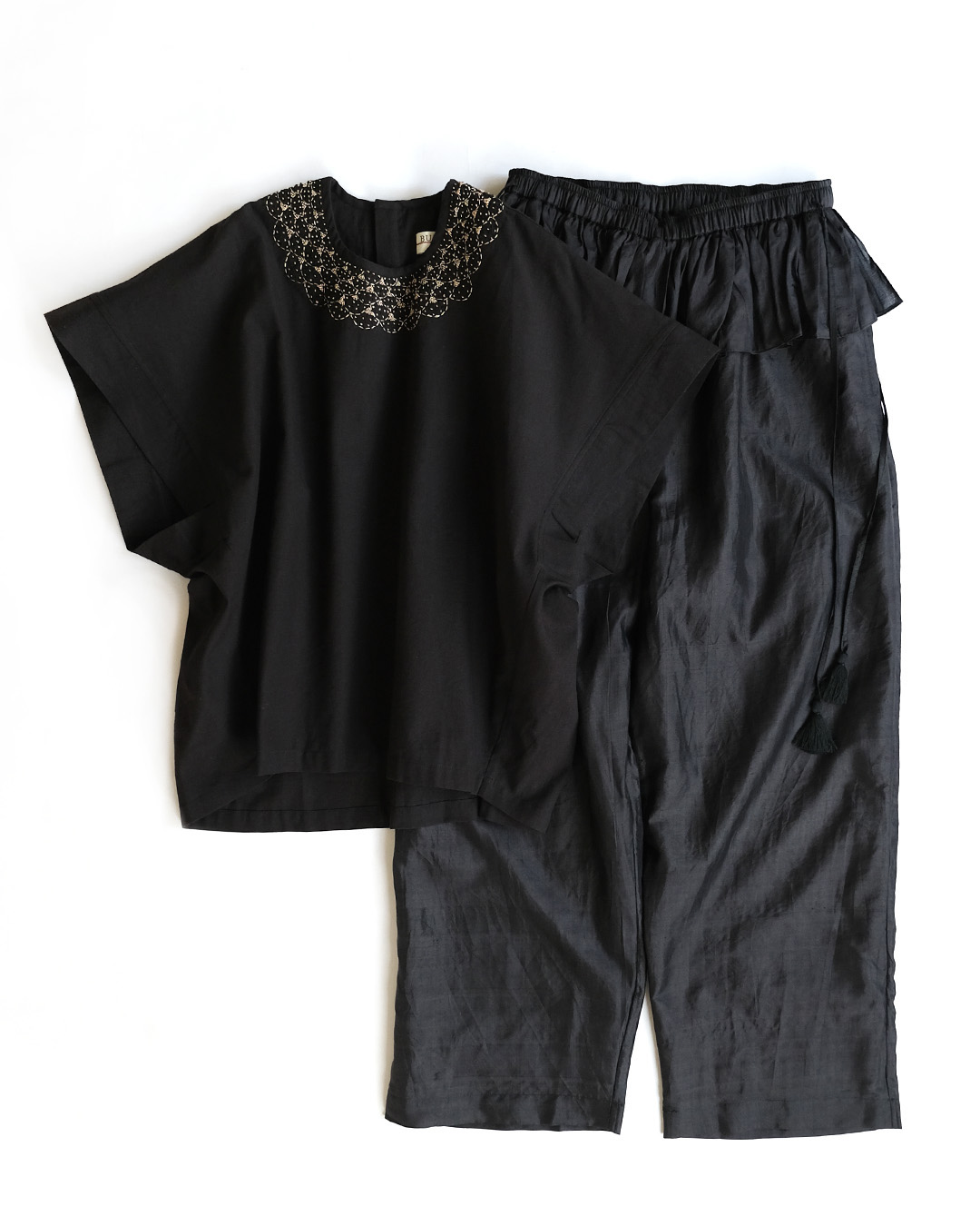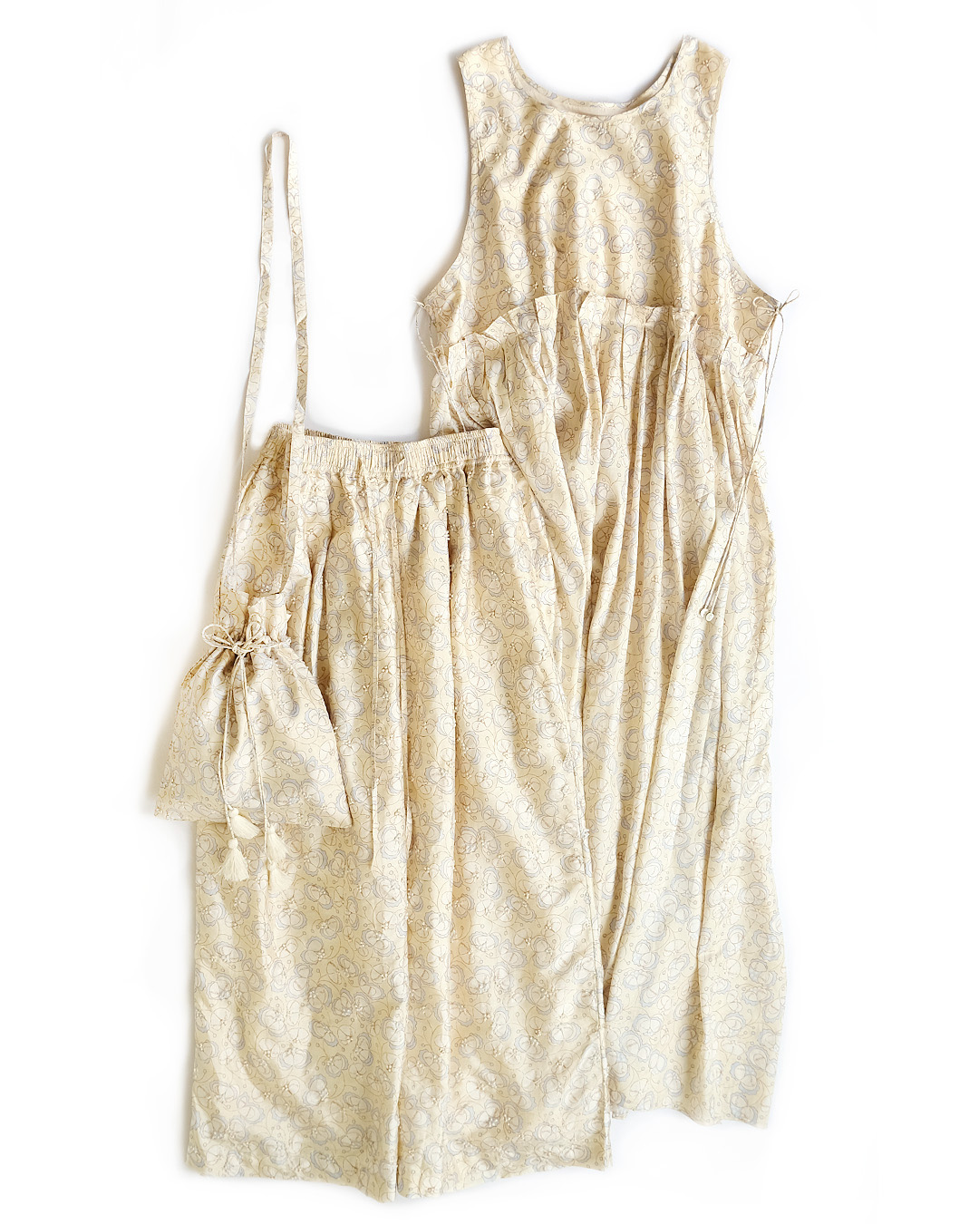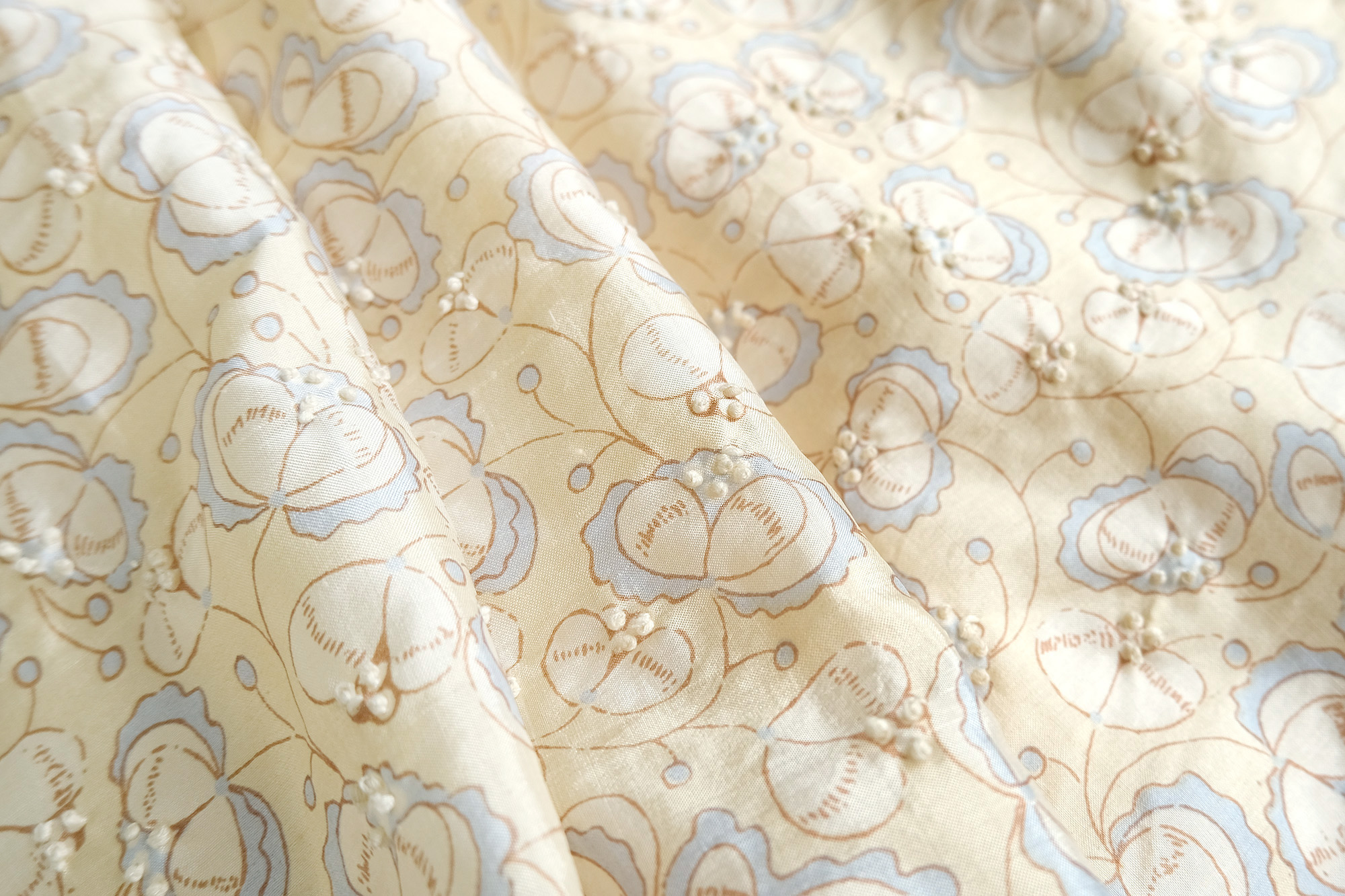 手紡ぎ手織りのカディシルクにプリントと刺繍をほどこした贅沢なシリーズ。