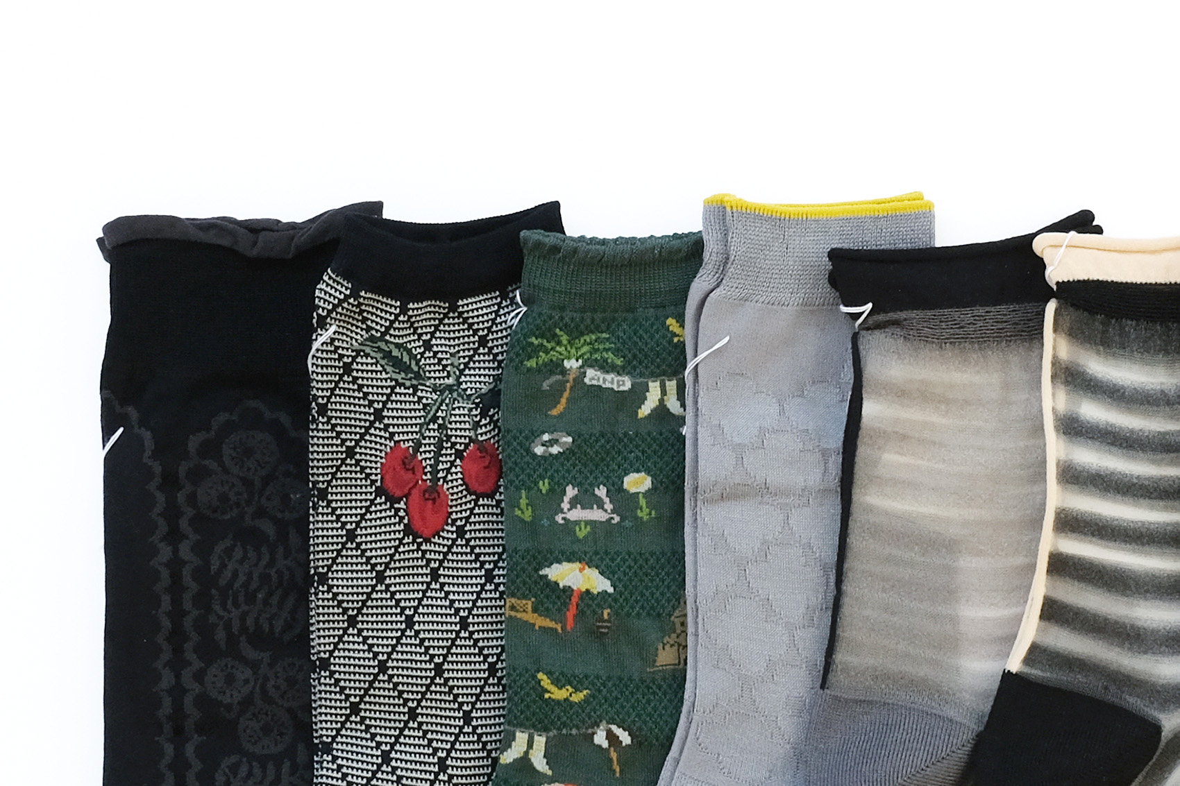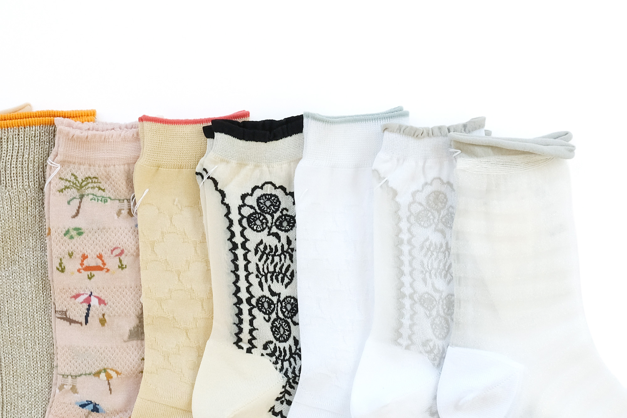無地ソックスと重ねて色を透かしてたのしむも良し、もちろん一枚で素肌の透け感をベースに涼やかに軽やかに夏らしくするのも良し、素足はちょっと…でもソックスは暑いな…というときに重宝する一足です。