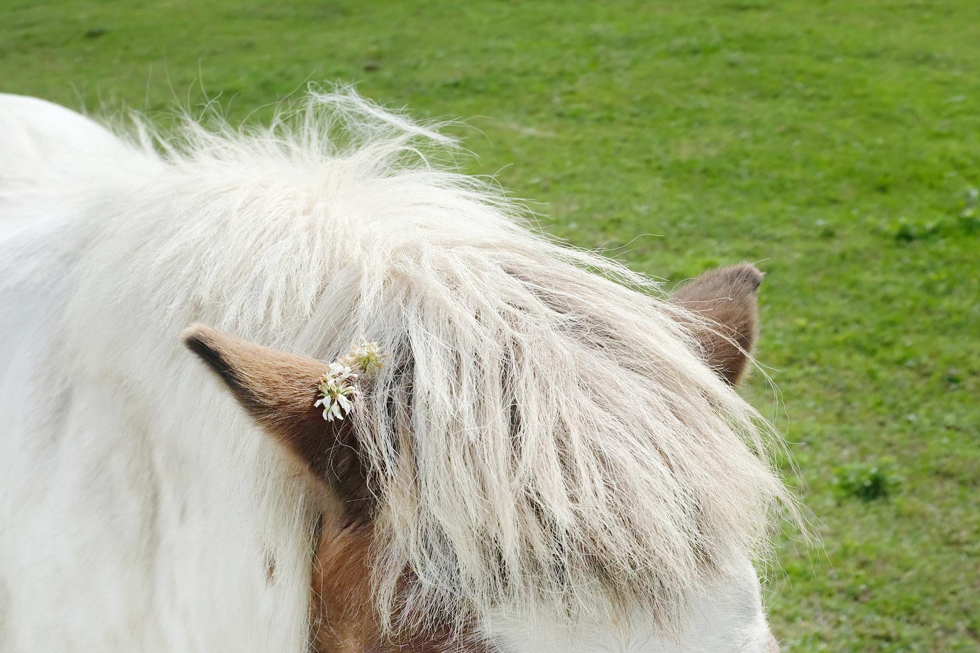 誰かがそっと耳元にシロツメクサの花を添えておめかししていた馬